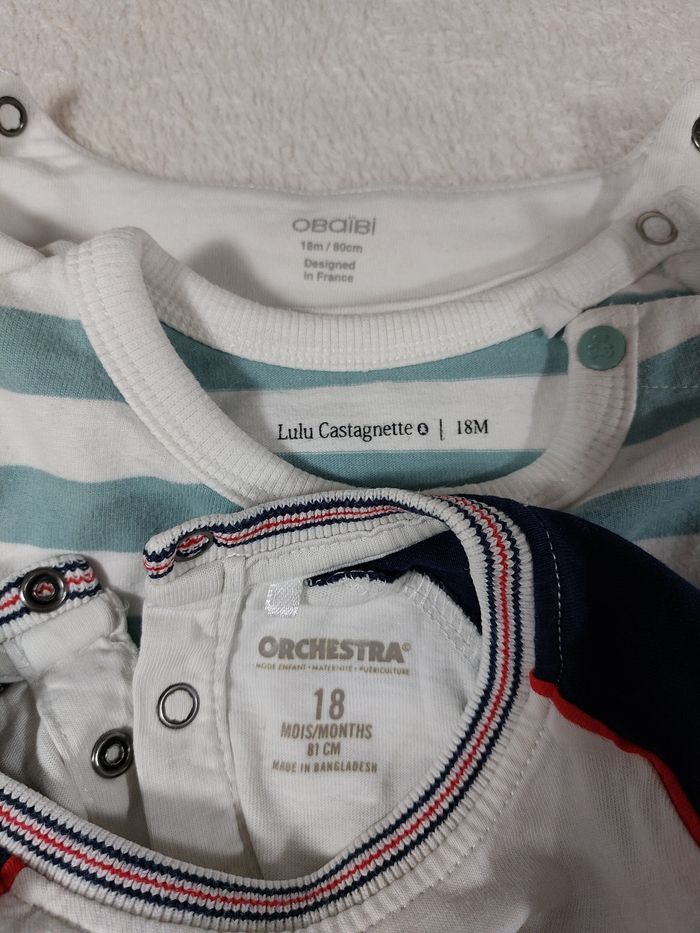 Lot de 3 t shirts à manches longues 18 mois Marques Obaïdi, Lulu Castagnette et Orchestra Une toute petite tâche en bas, sur le devant du t shirt rayé Obaïdi ( voir dernière photo)