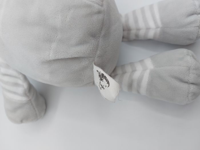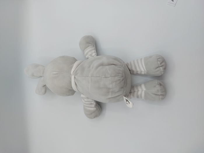 Peluche doudou lapin gris blanc rayures Kadirelli environ 40 cm - je n'arrive pas à lire la marque, l'étiquette étant effacée, au dos il est noté Kadirelli Bon état, tout doux - étiquette effacée, petite réparation à la patte gauche (photo 4), 2 traces blanches au dos qui ne sont pas des tâches mais des défauts du velours - lavé avant la vente Envoi rapide A11860 #minotresor #peluche #doudou #plush #knuffel #comforter