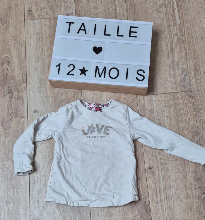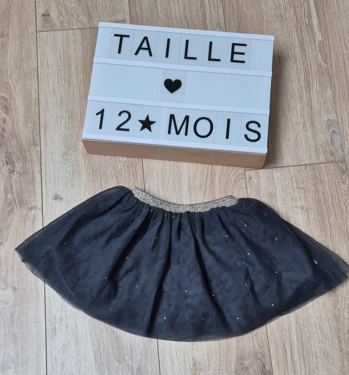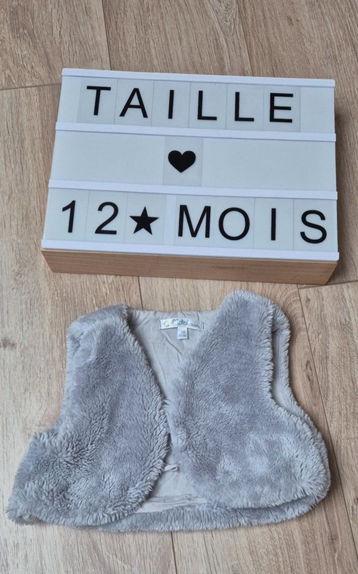 Vends un ensemble pour bébé fille taille 12 mois Il est composé d'une jupe effet pailletée, d'un gilet sans manches gris et d'un tee shirt réversible. Le tee shirt peut être porté des 2 côtés.