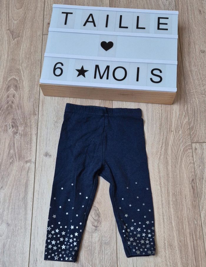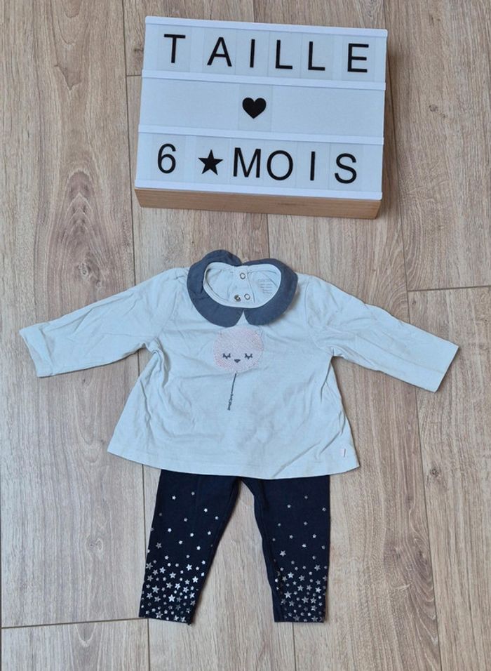 Vends un ensemble pour bébé fille taille 6 mois Il est composé d'un tee-shirt à longues manches Marque Obaibi 100% coton Et d'un legging 6-9 mois de marque Primark avec motif étoiles sur le bas