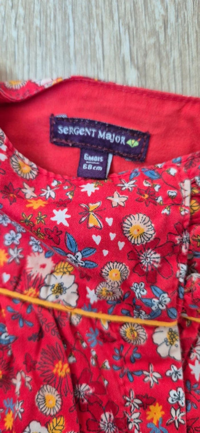 Vends une blouse pour bébé fille taille 6 mois Marque Sergent Major Motif fleuri coloré rouge Ouverture par devant avec pressions et boutons pour faciliter l'enfilage.