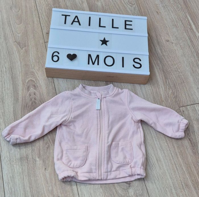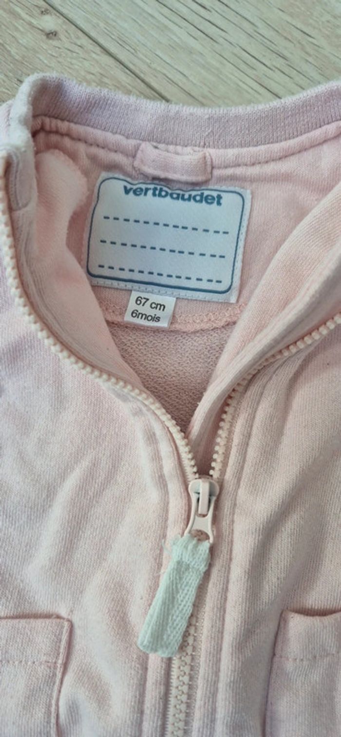 Vends une veste de sport pour bébé fille taille 6 mois / 67 cm Marque Vert Baudet Fermeture éclair Coloris rose pâle et motif dans le dos.