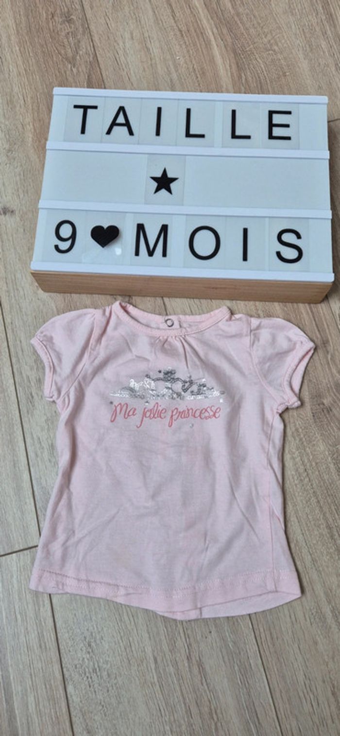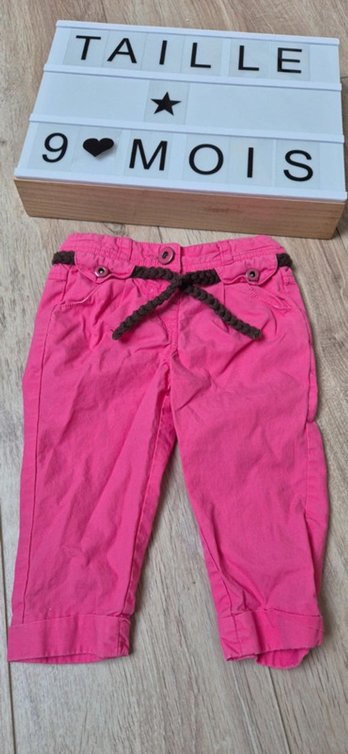 Vends un ensemble pour bébé taille 9 mois, composé d'un pantalon rose de marque Tape à l'œil et d'un tee shirt manches courtes Kimbaloo