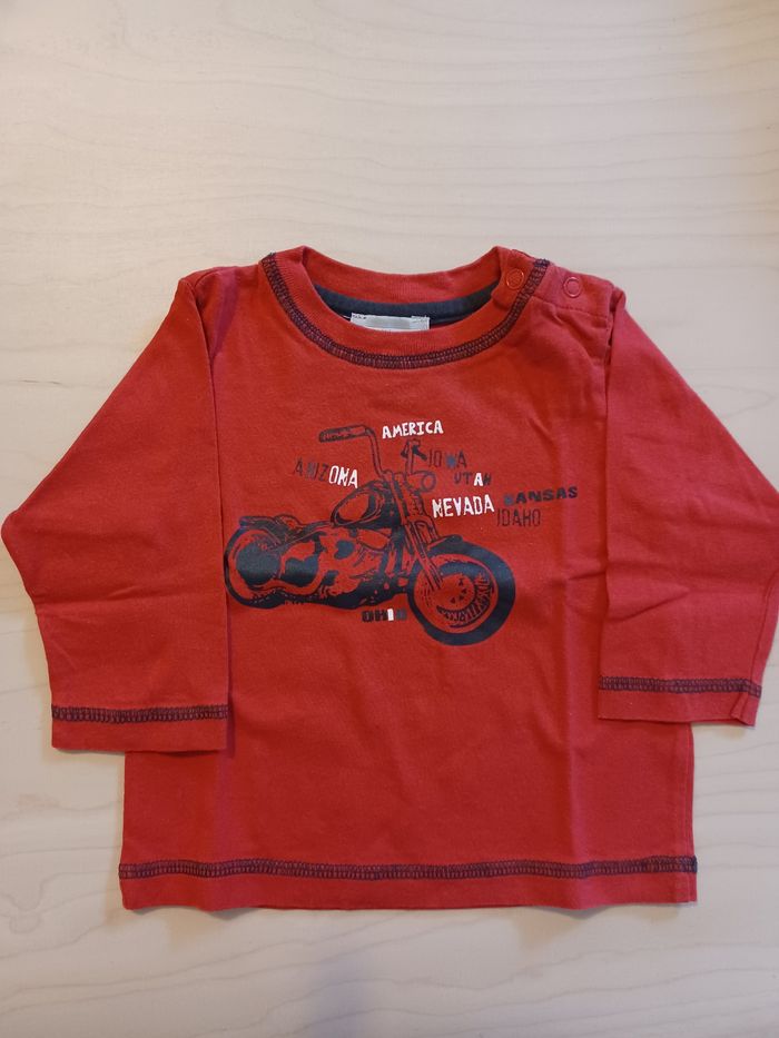 Tee shirt rouge à manches longues et dessin de moto sur le devant
