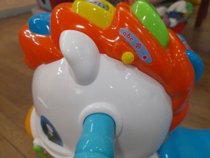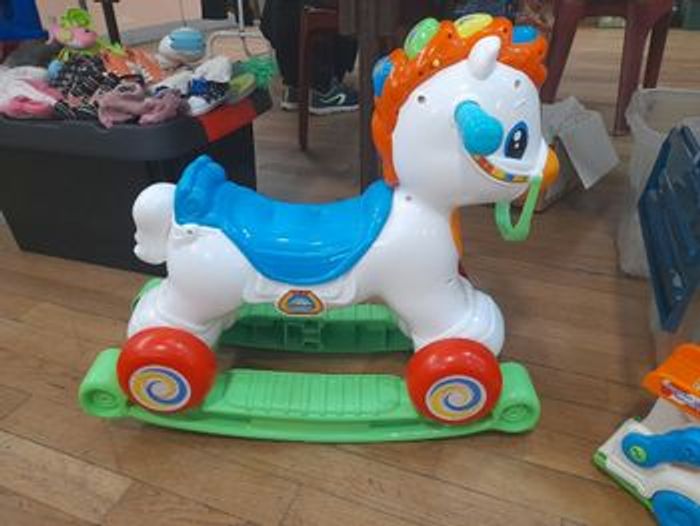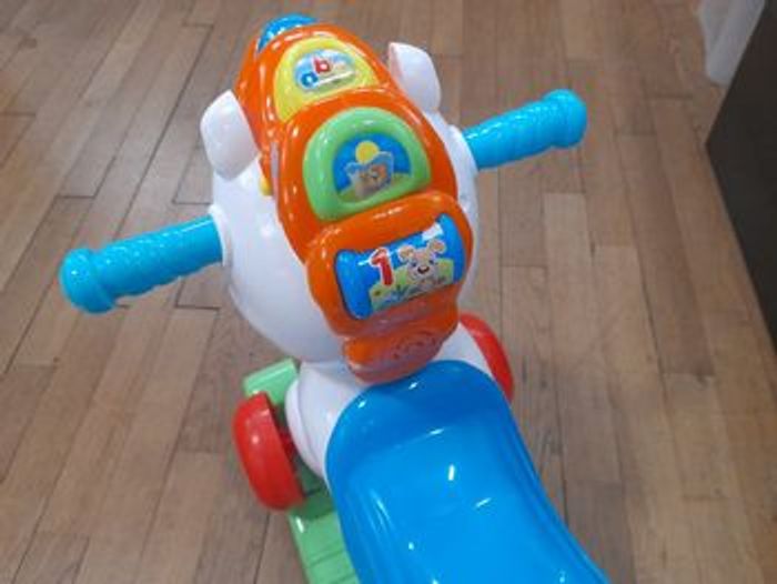 Cheval à bascule interactif. Les éléments qui servent de bascule peuvent s'enlever pour en faire un trotteur. Il parle français et aussi anglais.