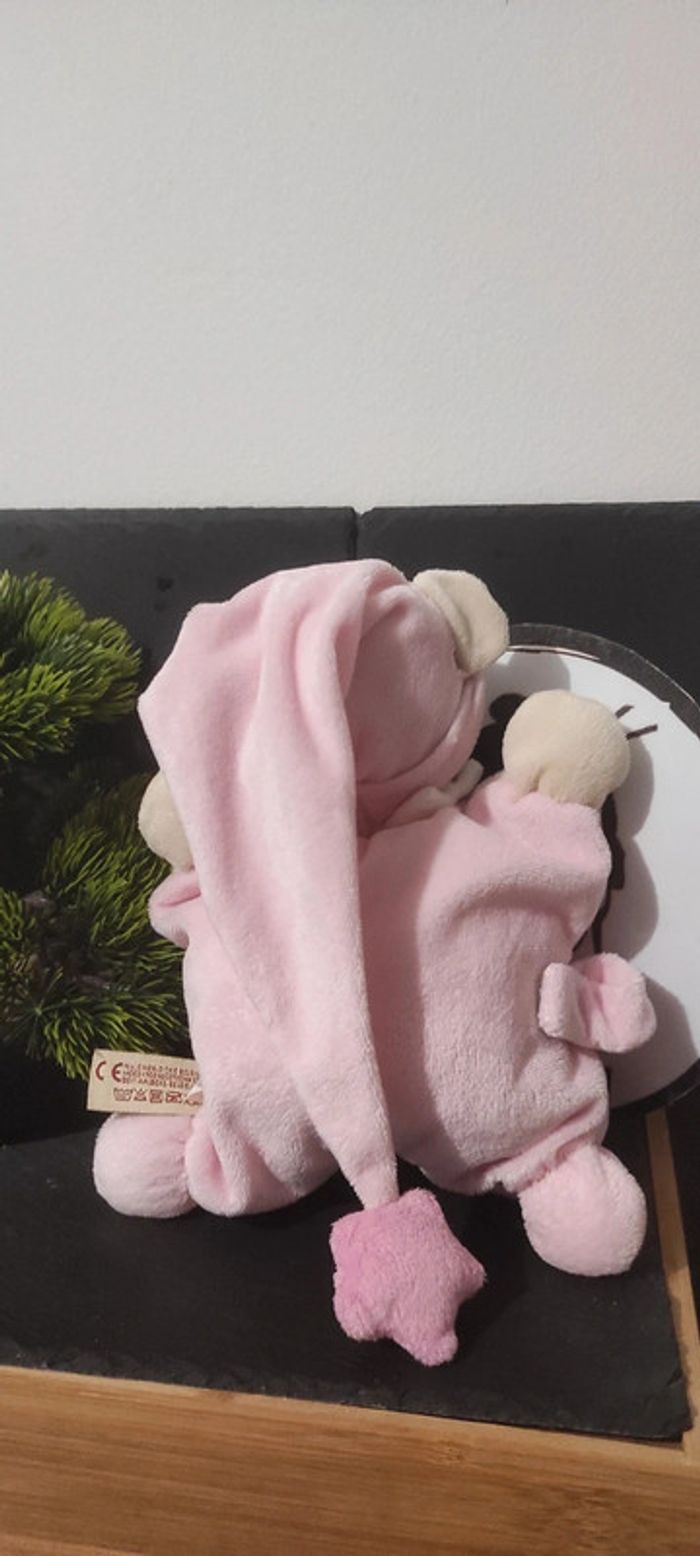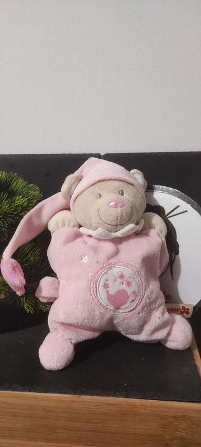 Doudou coussin semi plat ours rose Oiseau Nicotoy bonnet rond marron Étoile