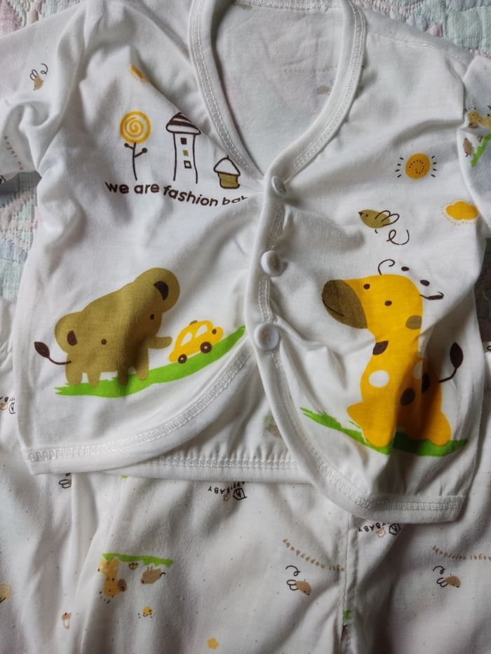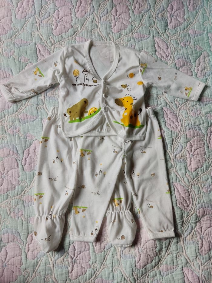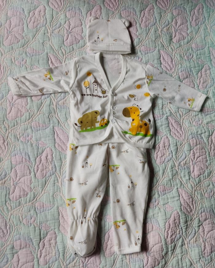 Pyjama deux pièces très fin + bonnet. 2 pantalons : un avec pieds, l'autre sans pieds. Neuf, jamais utilisé. Taille 1-3 mois je penses.