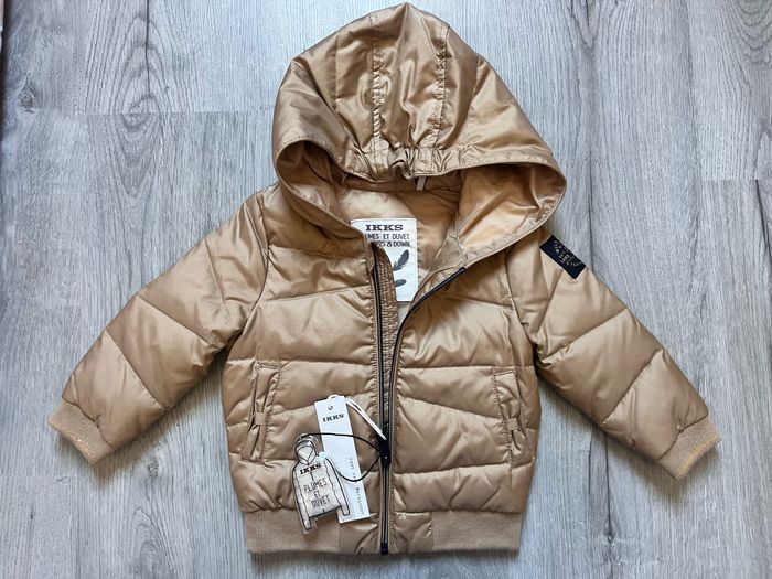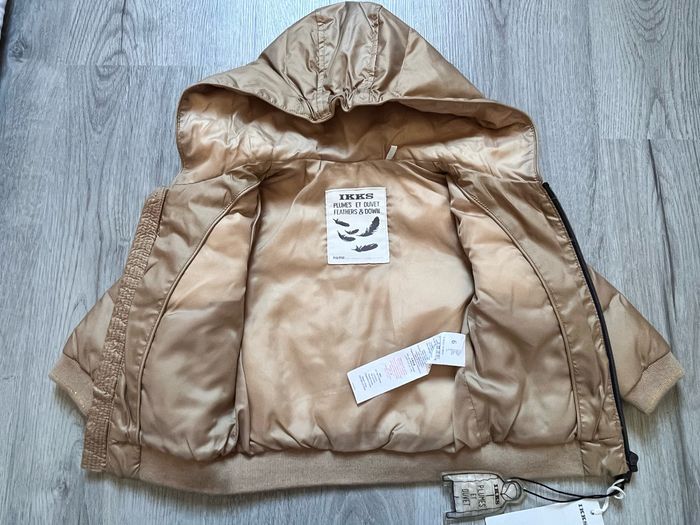 Jolie doudoune bébé fille IKKS En duvet (70%) et plume (30%) pour un très bon confort (pas très épais mais très chaud) Taille 6 mois idéal 4-5mois en cas de gros pull en dessous. Neuve jamais portée car n’a pas correspondu avec la taille et saison de ma fille.