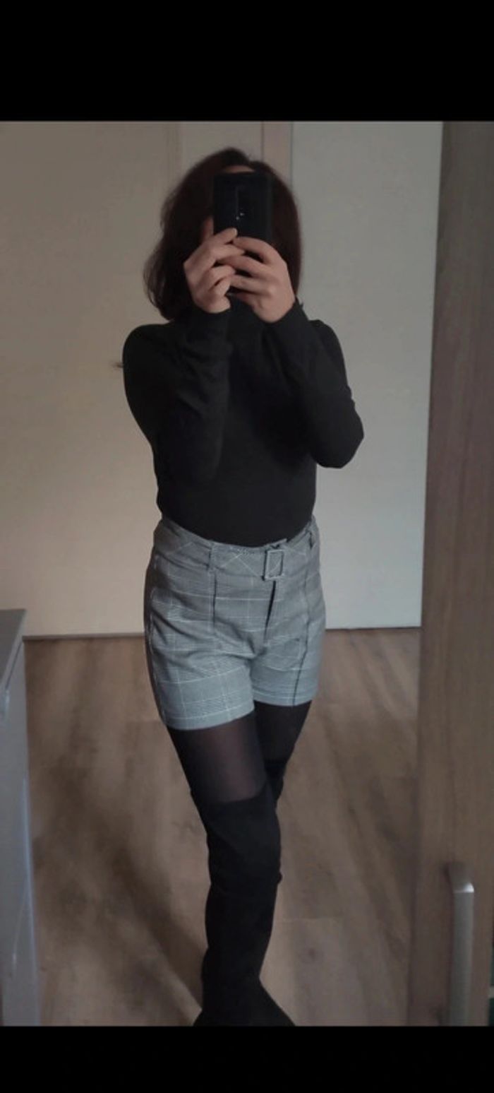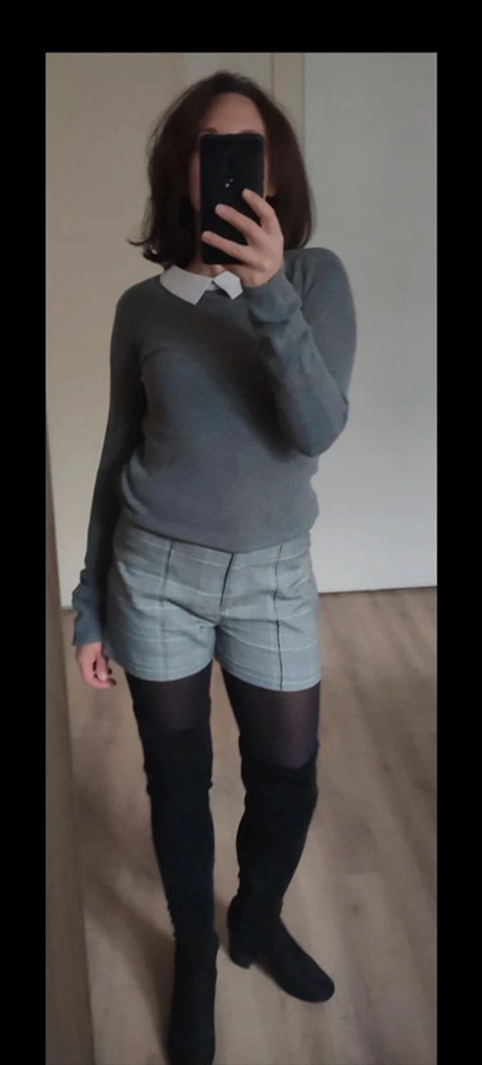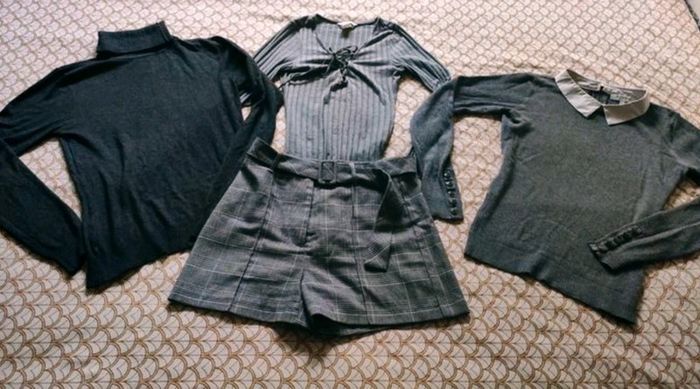 Joli petit lot de vêtements gris pouvant être utilisés ensemble ou séparément, idéal pour l'automne hiver. Composé de : - 1 short court prince de Galles Pimkie neuf, seule l'étiquette à été retirée et il a été porté pour mise en vente - 1 body H&M gris en très bon état - 1 top en maille ajourées serrées et col pelle à tarte (col claudine mais pointu) Morgan, en très bon état - 1 pull à col roulé anthracite en acrylique Vero Moda, en très bon état. Toutes les pièces sont intemporelles et indémodables, et sont parfaites ensemble. Tenues idéales avec des bottes ou des cuissardes. Prix 25€ (soit le prix neuf du short à lui tout seul) D'autres articles en 34 par ici : #femme34elpi2201 #trendy #carreaux #workinggirl #pimkie #pinkie #veromoda #hetm #h&m #morgandetoi #morgan