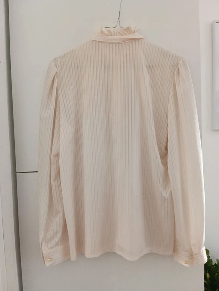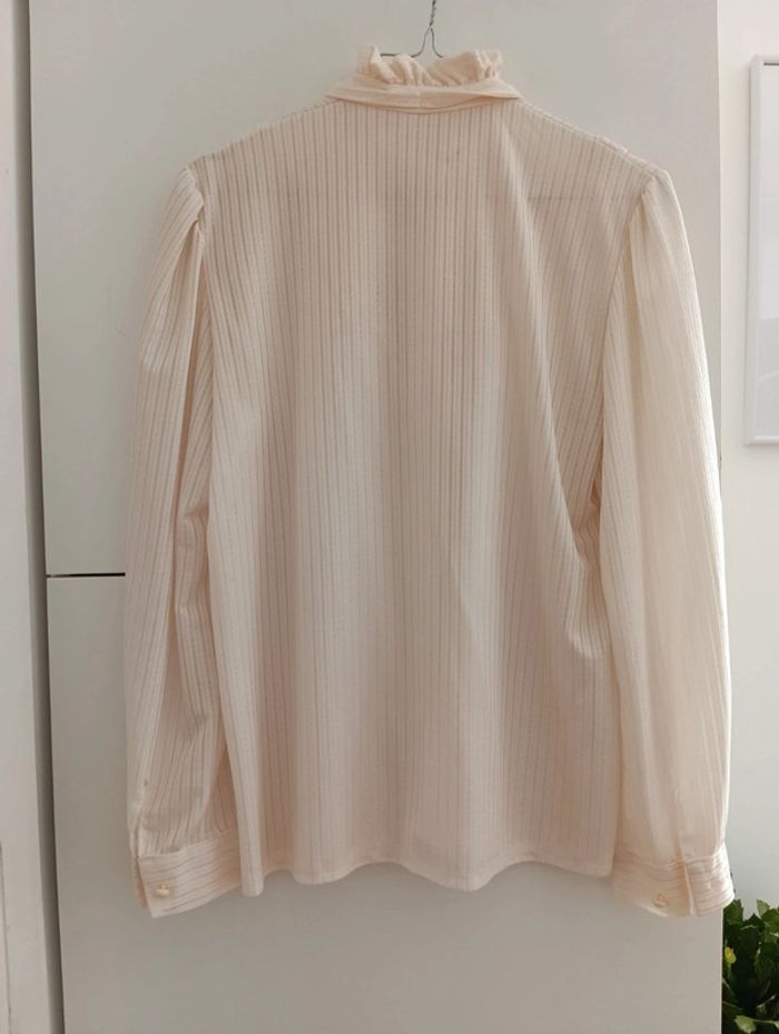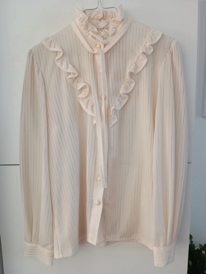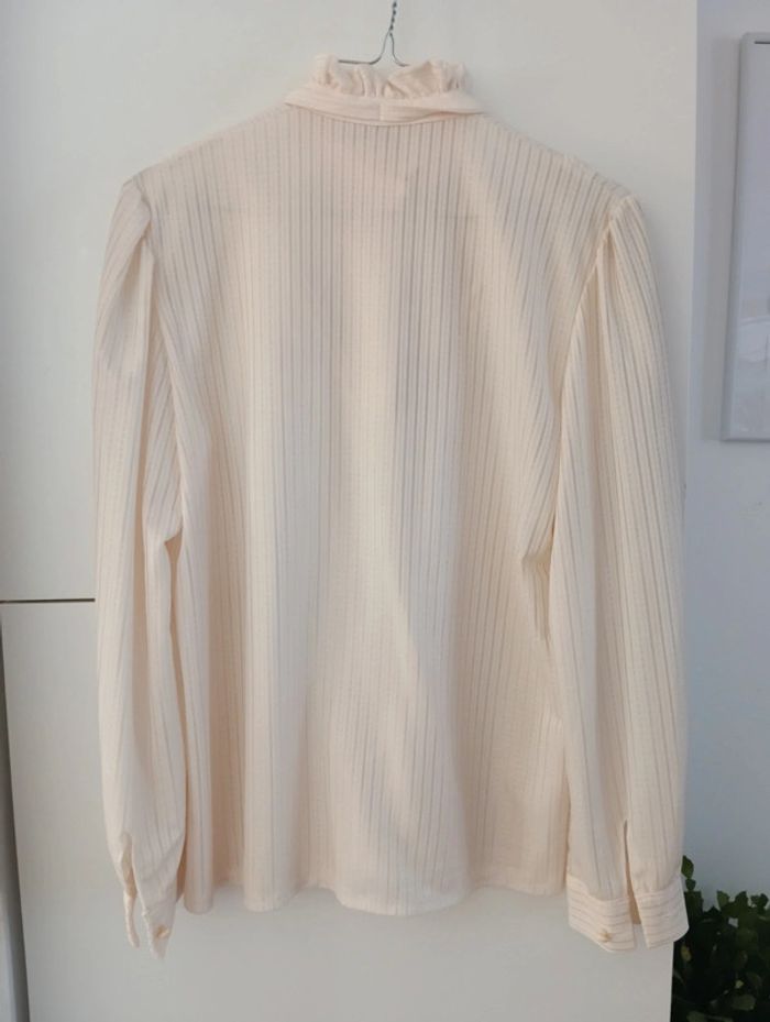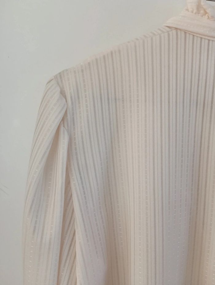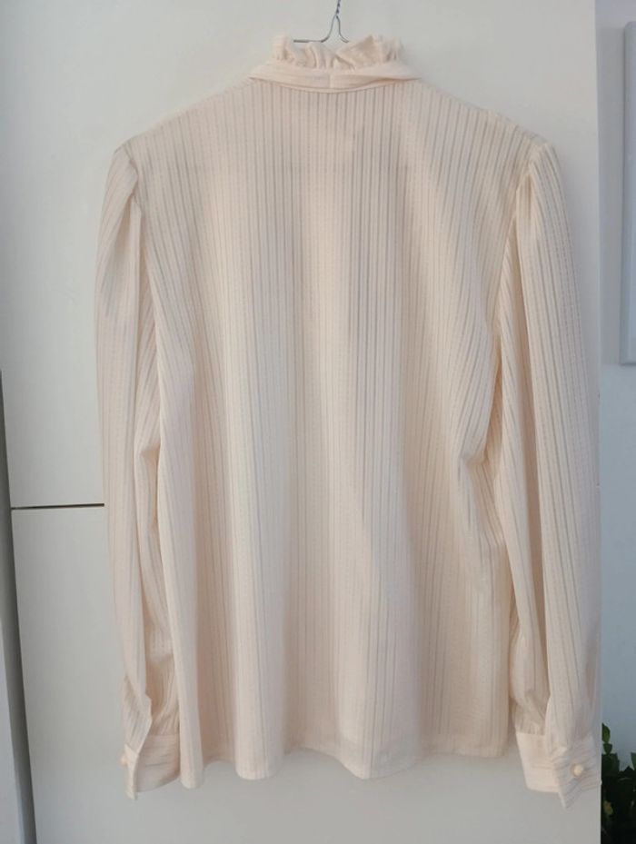 Chemise vintage froufrou manches longues Lien au col, Fines rayures , légèrement transparente. Made in France, polyester Taille 38 estimée à confirmer avec les mesures Mesures Epaules 38cm Aisselles 49cm Longueur 63cm