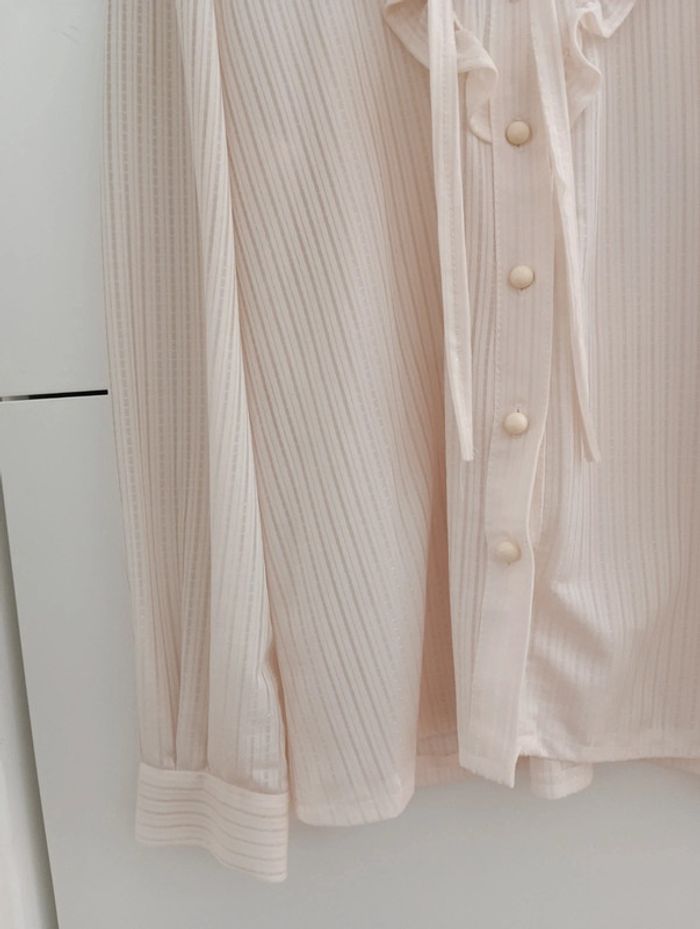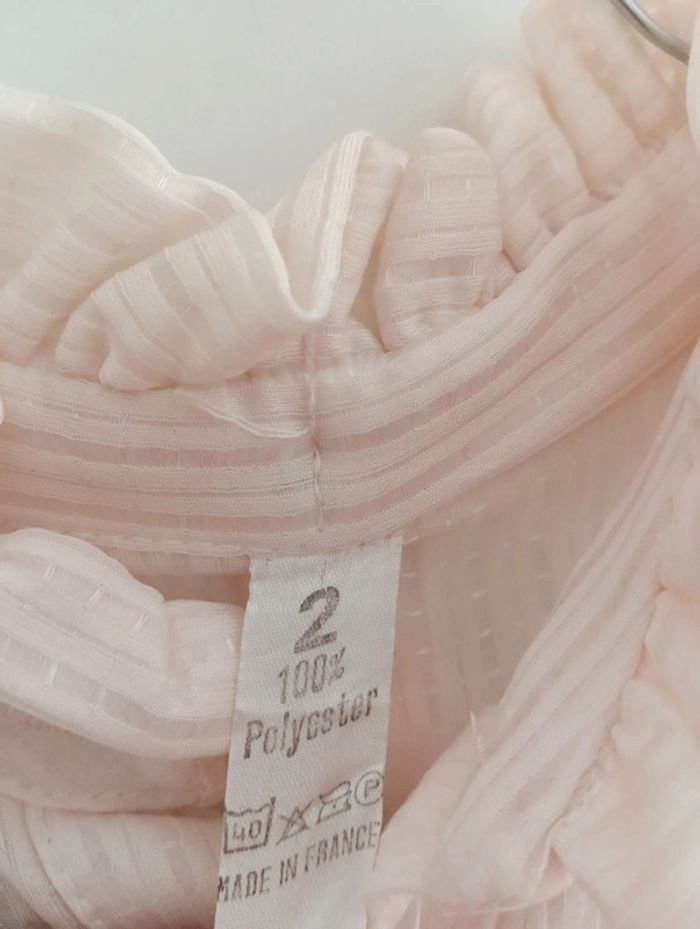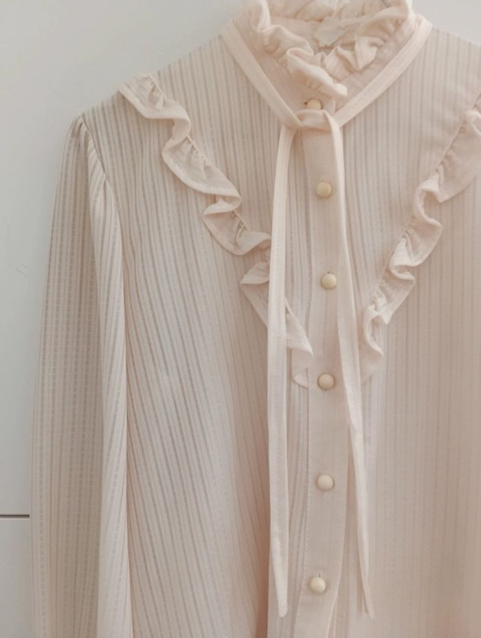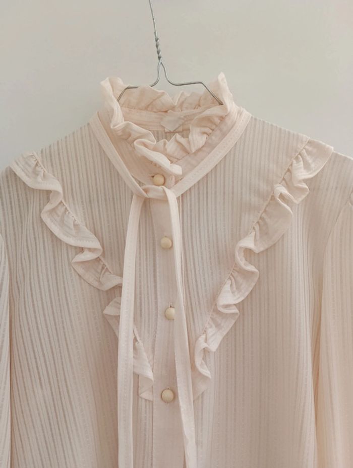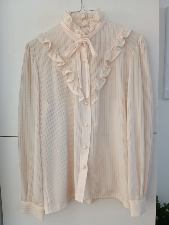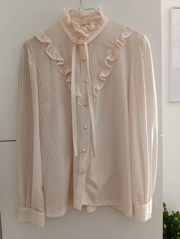 Chemise vintage froufrou manches longues Lien au col, Fines rayures , légèrement transparente. Made in France, polyester Taille 38 estimée à confirmer avec les mesures Mesures Epaules 38cm Aisselles 49cm Longueur 63cm