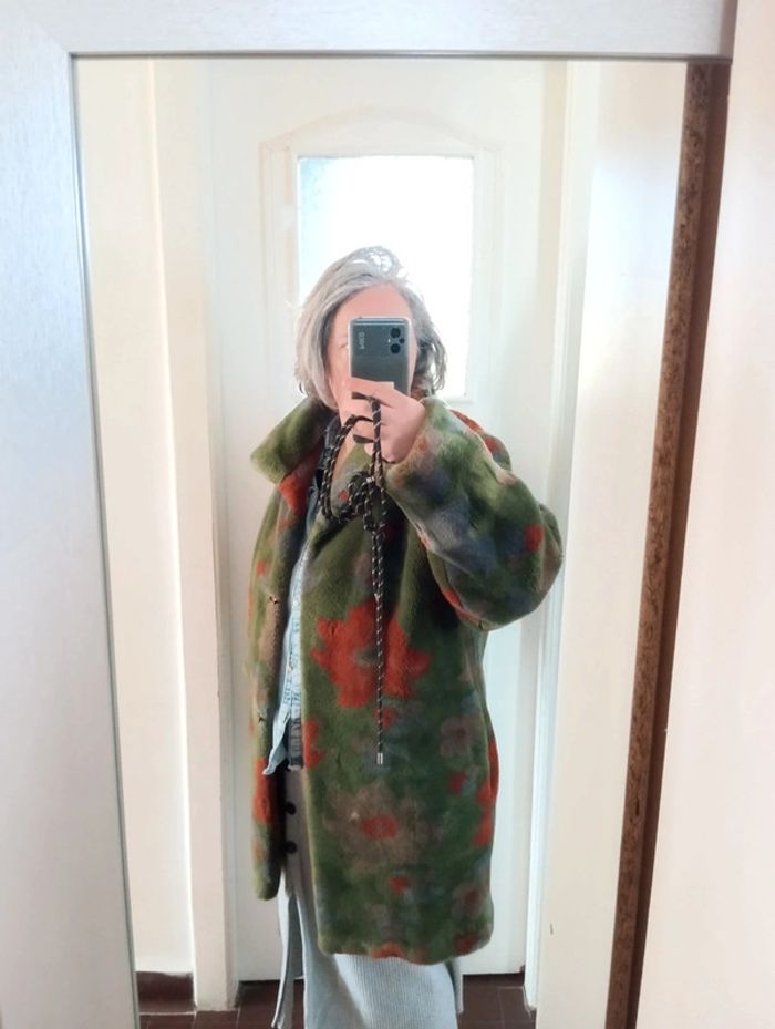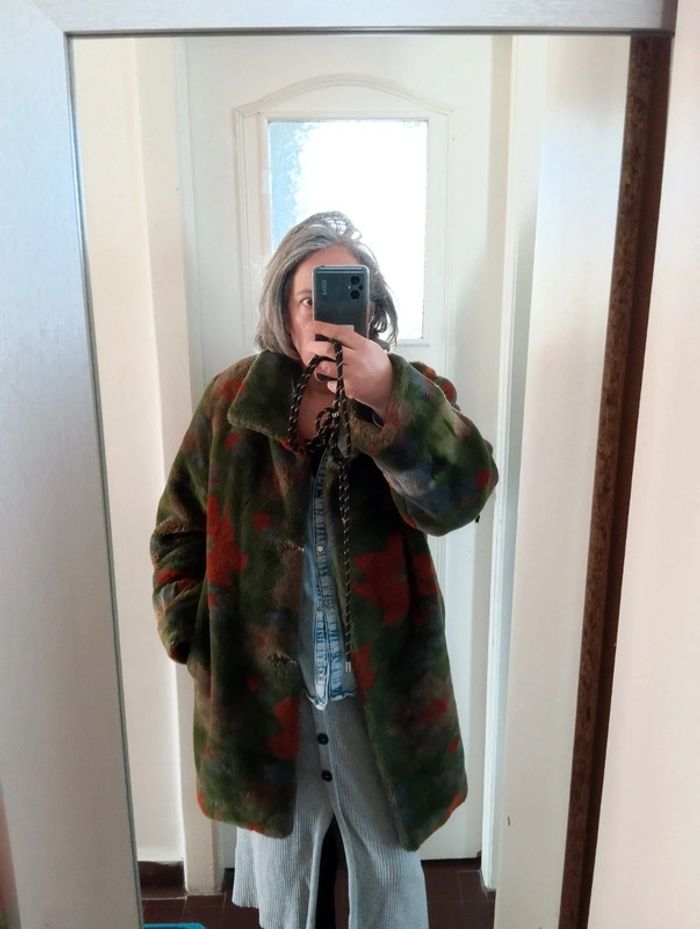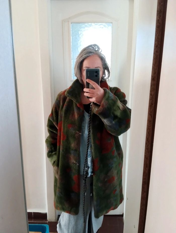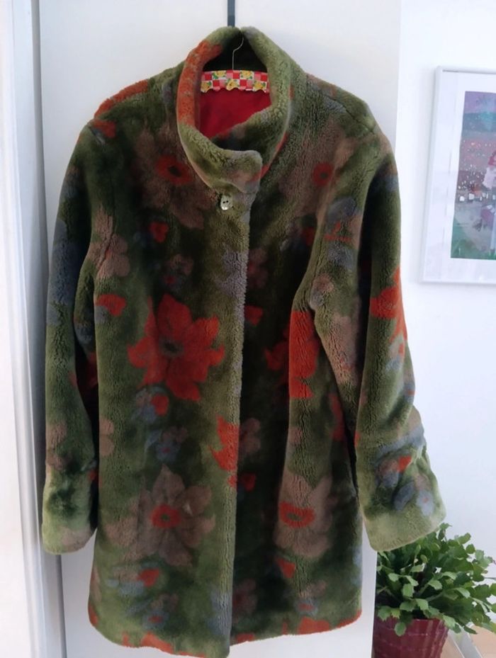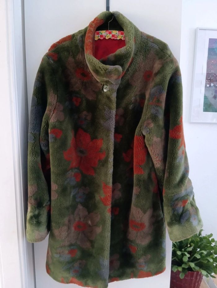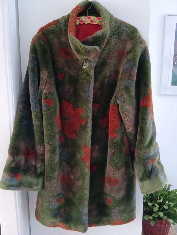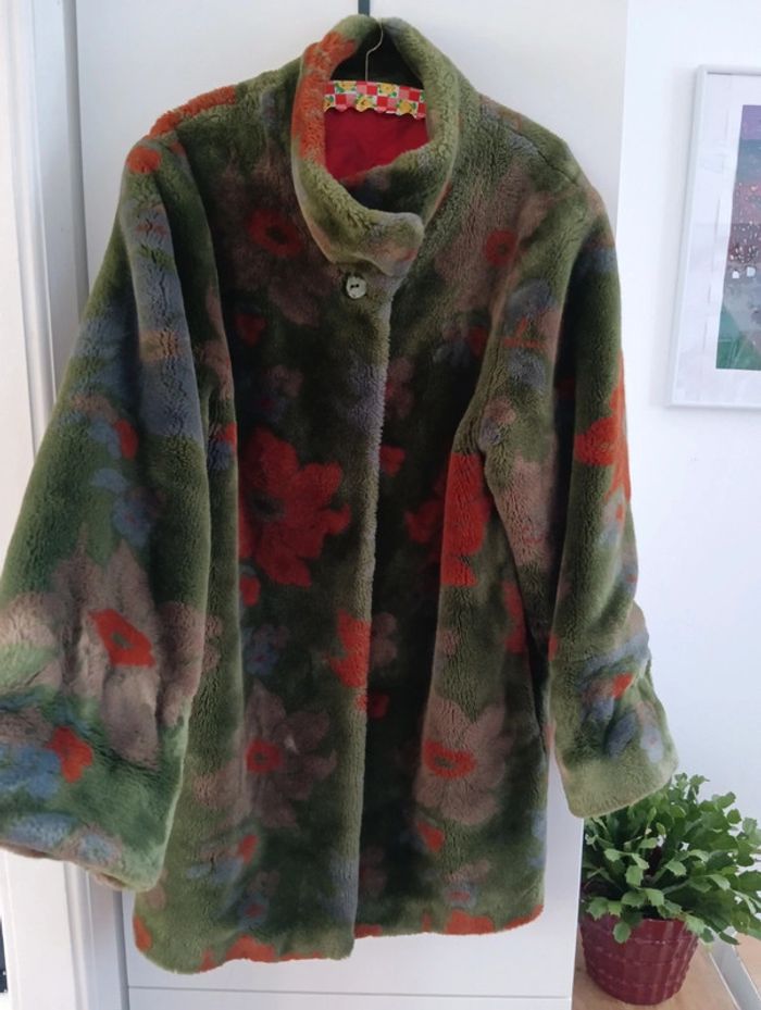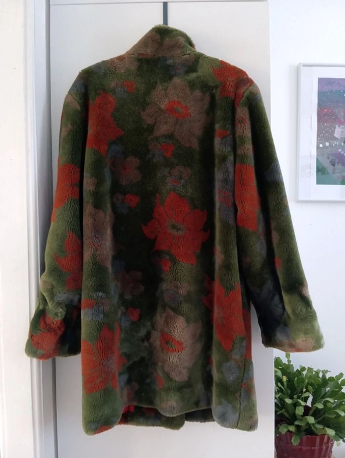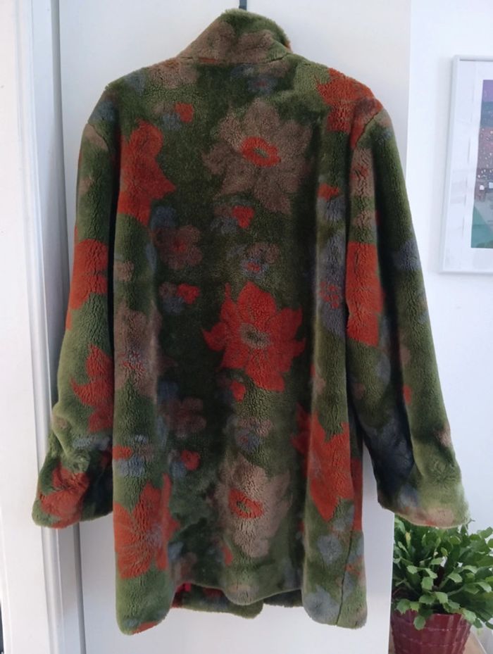 Rare Veste vintage fausse fourrure , Fond kaki,imprimé fleurs multicolores Fermeture crochets, Mesures Epaules 49cm Aisselles 58cm Longueur 92cm