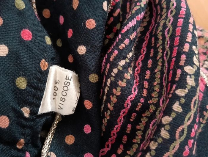 Blouse tunique vintage noire et fleurie Col montant 100% viscose Détails lurex, Multicolore, style patchwork. Taille 36/38 estimée à confirmer avec les mesures Épaules 37cm Aisselles 45cm Longueur 76cm