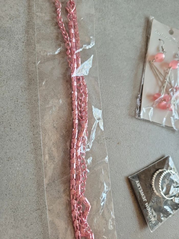 Lot bijoux rose et argenté boucles d'oreilles sautoir collier créatifs et charme cœur k3 - photo numéro 3