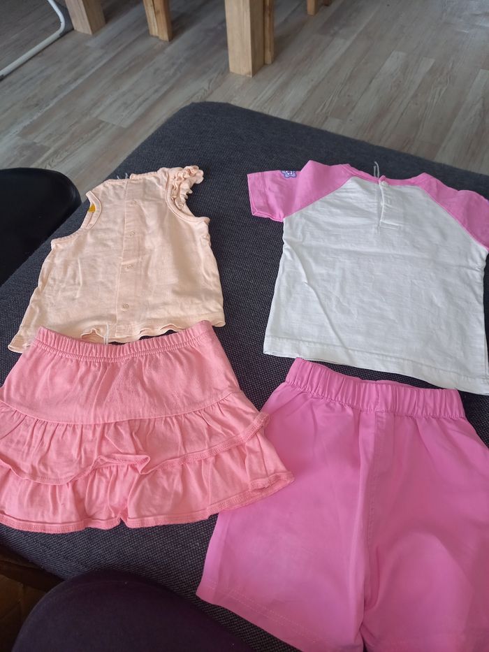 Lot de 2 ensembles: 1 avec un débardeur + une jupe taille élastique marque Kitchoun. 1 avec tee-shirt manches courtes + short rose.