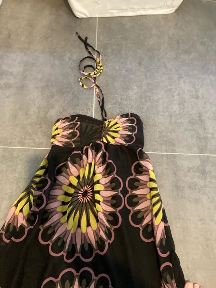 Robe bustier doublée à coques avec cordon pour passer autour du coup. Peu portée, très bon état Froncée à l'arrière au niveau de la poitrine pour ne pas compresser Sans marque, achetée dans une petite boutique en vacances, taille 2