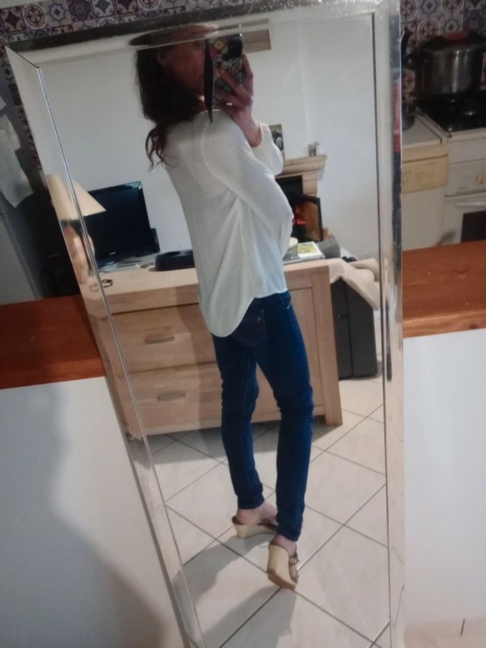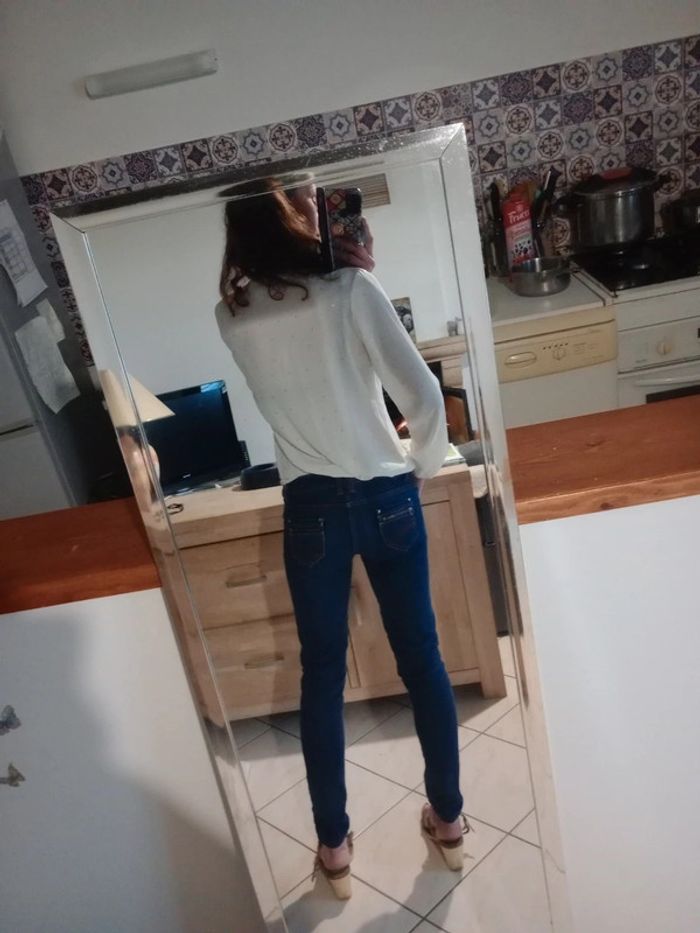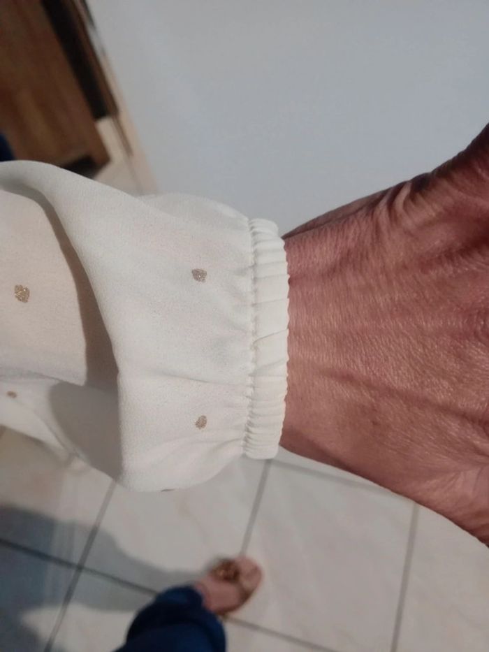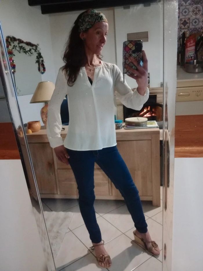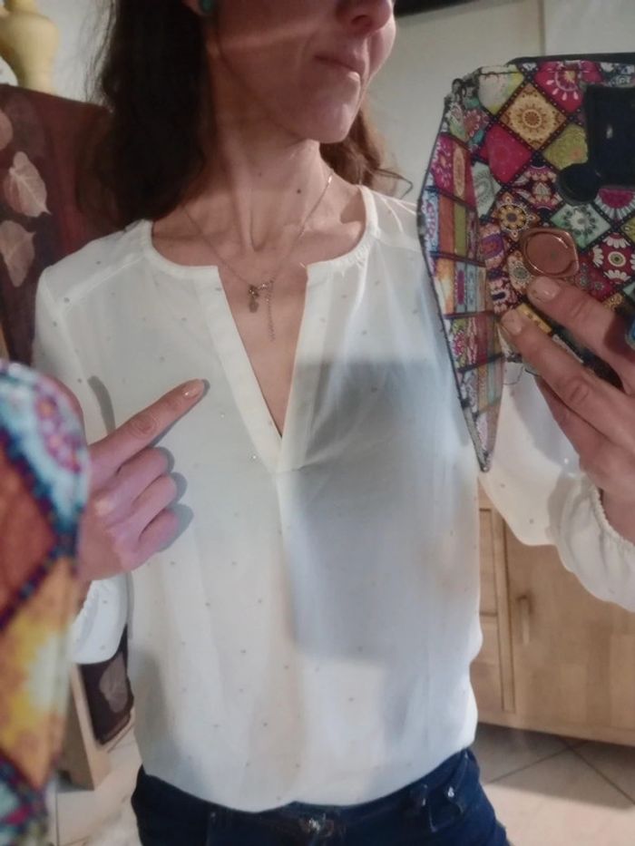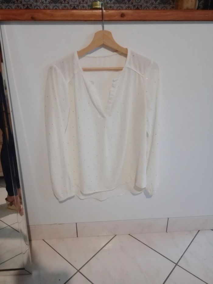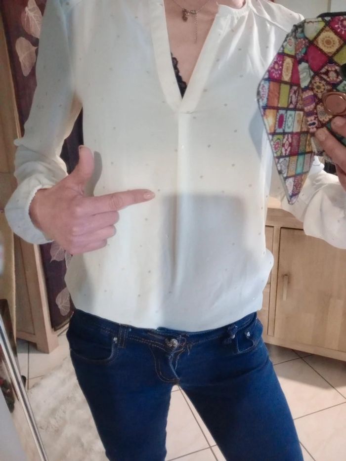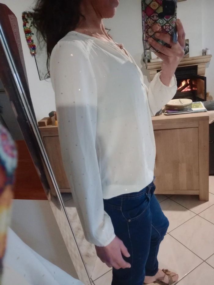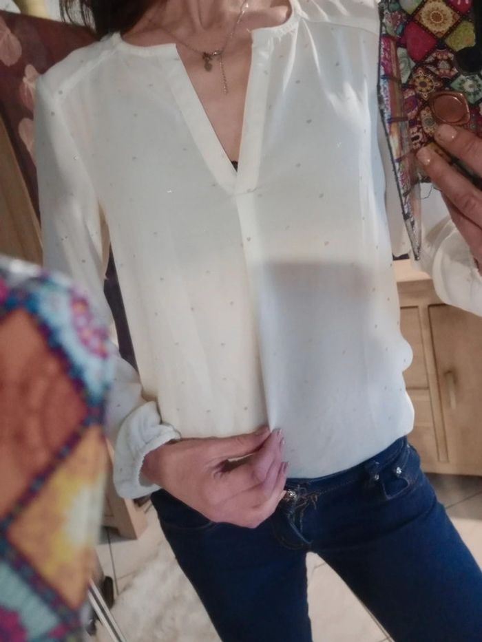 Superbe pièce 😍 magnifique 🤩 peut-être porter pour occasion comme quotidiennement Indémodable et intemporelle, cette blouse dispose d'un joli col v joliment fini Jolie couture également au niveau des épaules qui lui donne un look très féminin Élastique au bout des manches Présence de nombreux points dorés pailletés qui renvoient la lumière 🥰 Plus longue derrière que devant Plus d'étiquette matière ni taille, je pense à du polyester , ni marque je pense que c'était Camaïeu Epaule 38 cm longueur devant 63 cm, derrière 68 cm Aisselle 50 cm #carineleray_femme_38