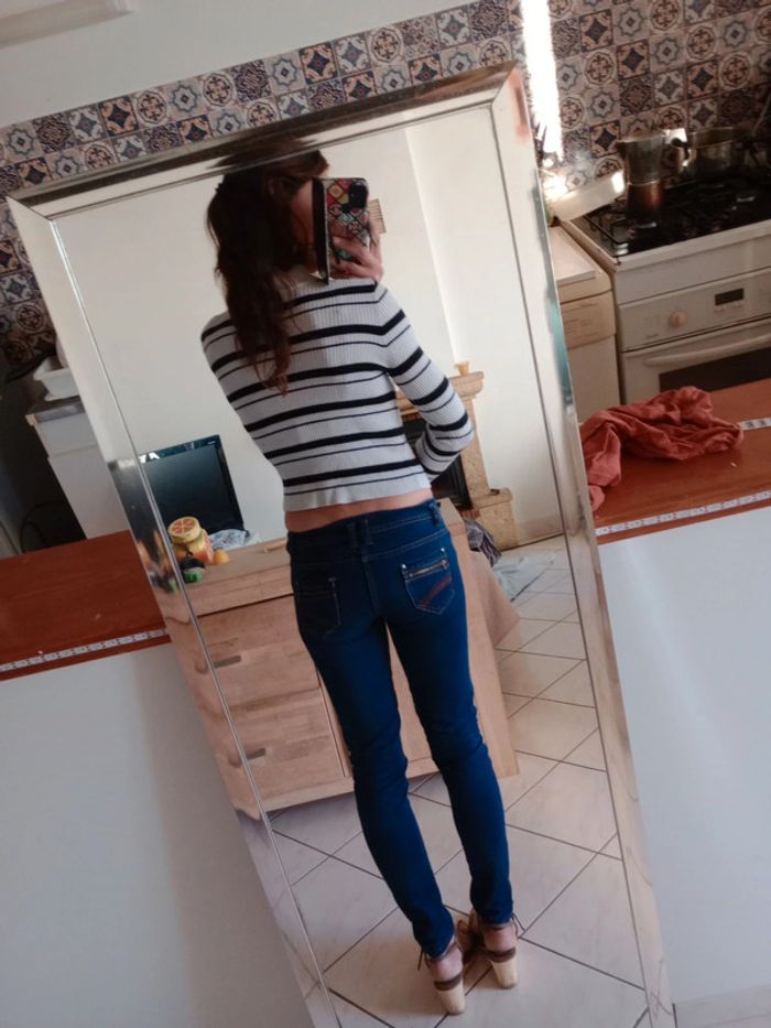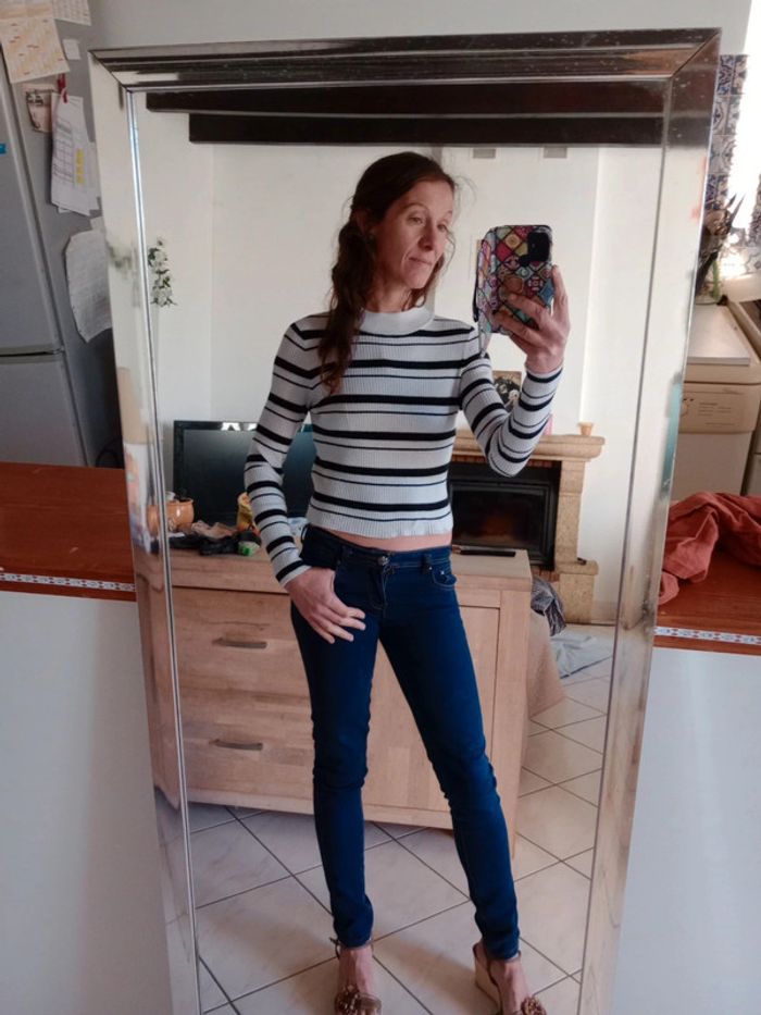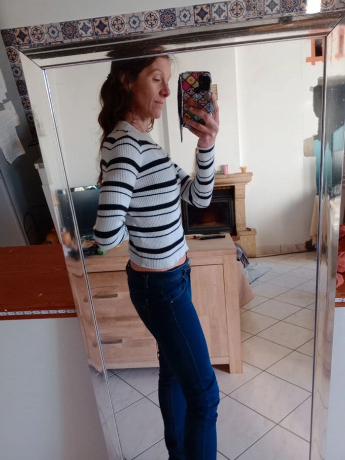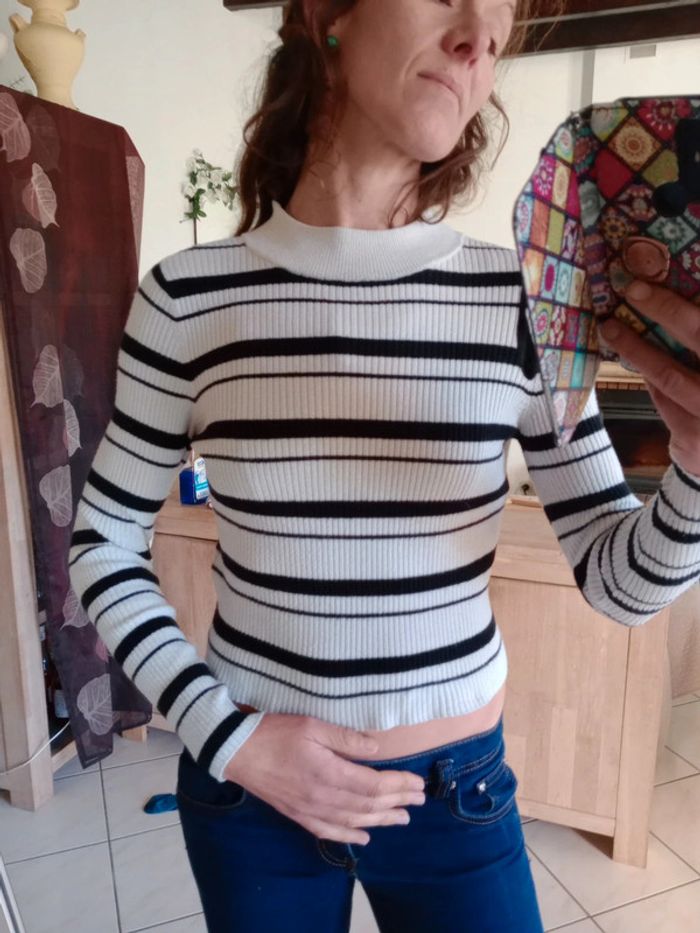 Pull fin chaussette Trop court pour moi 😅 Indiqué taille s pour moi c'est plutôt un XS Longueur 46 cm épaule à épaule 38 cm Aisselle à aisselle 47 cm #carineleray_femme_34