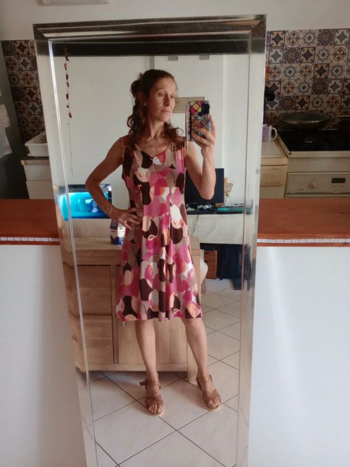 Jolie robe colorée : rose orange saumon marron beige crème Bretelles larges : 6 cm Agréable à porter, fluide... comme une seconde peau... Contient de l'élasthanne et donc étirable Longueur 100 cm Aisselle à aisselle 53 cm Épaule à épaule 38 cm #carineleray_femme_42