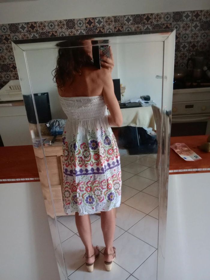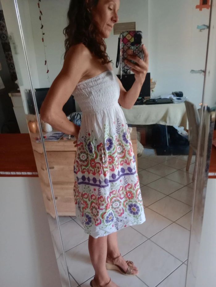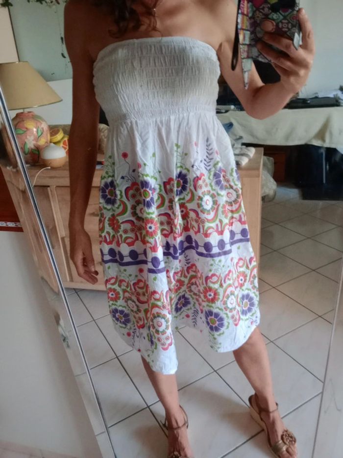 Robe avec large bandeau au niveau de la poitrine, élastique pour toutes sortes de poitrine Longueur du bandeau 16 cm Véritablement blanche avec de jolis motifs Fleuries Longueur totale de la robe 76 cm Légère et confortable idéal l'été #carineleray_femme_38