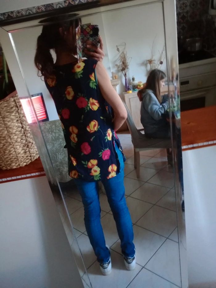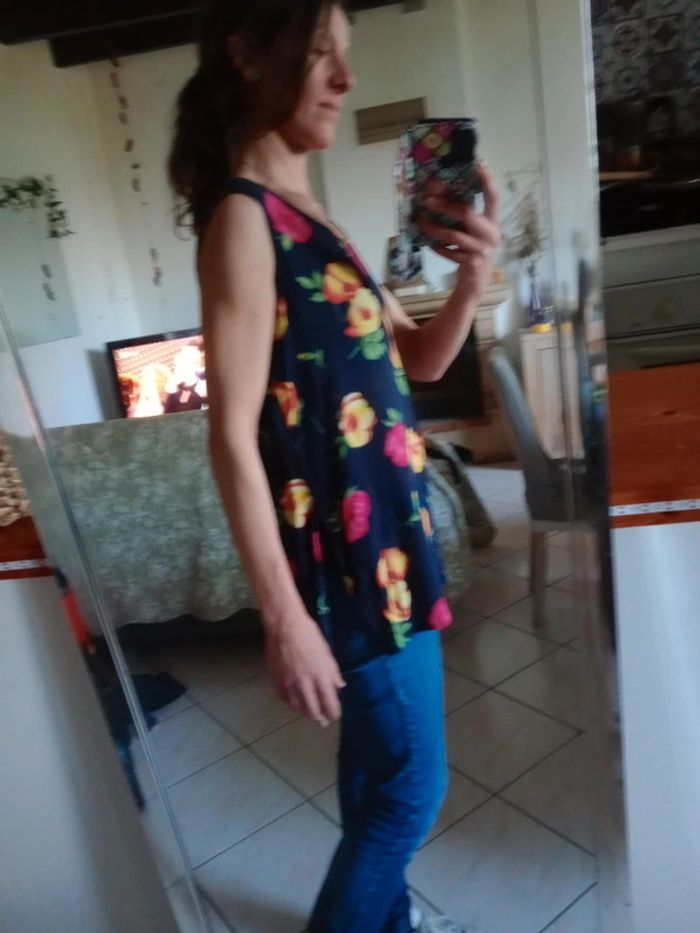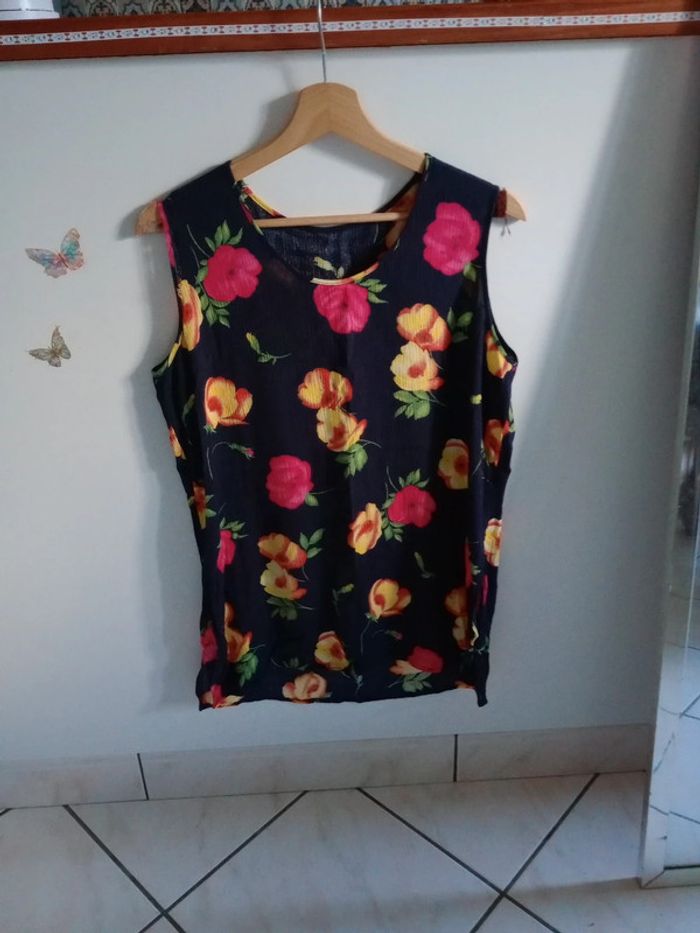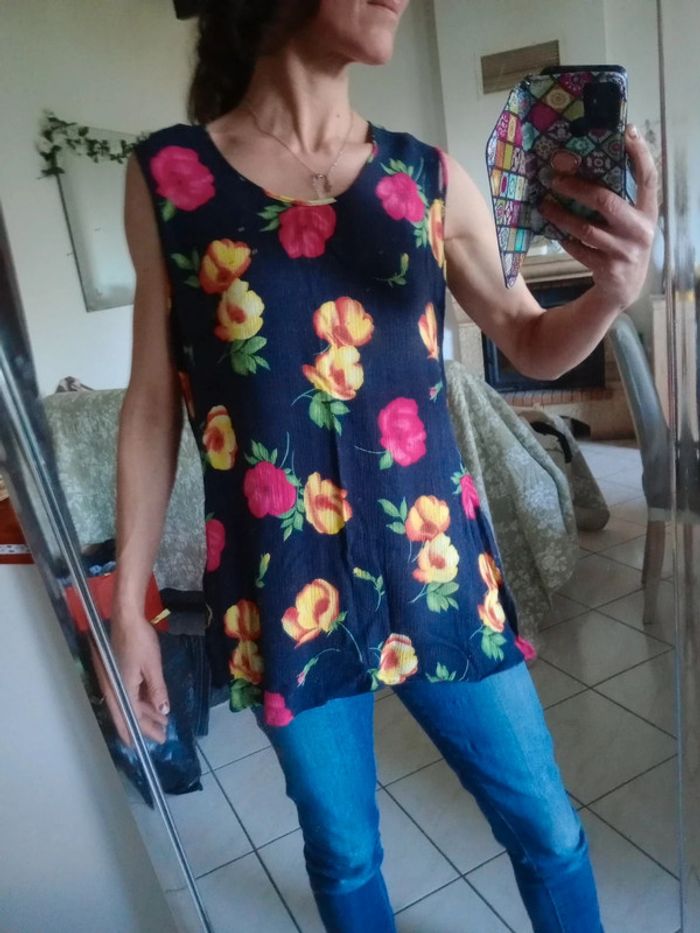 Débardeur à large bretelles 8 cm légèrement gaufré Fendu de chaque côté longueur 74 cm épaule à épaule 36 cm Aisselle à aisselle 53 cm Décousu sur la manche droite voir dernière photo facile à recoudre #carineleray_femme_42