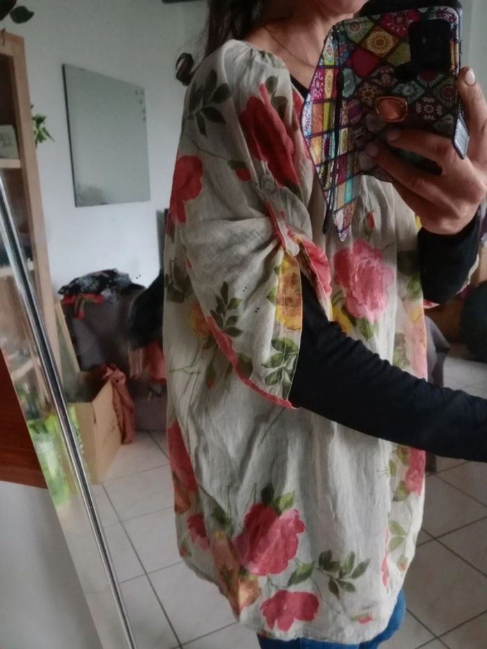 Très jolie pièce parfaitement entretenue, légère et confortable Manches 1/2 qui peuvent être remontées. grâce à un bouton et un lien Col rond avec un petit bouton Plus d'étiquette taille Aisselle à aisselle 66 cm #carineleray_femme_44