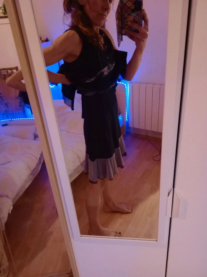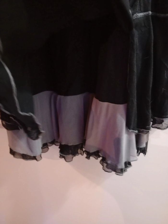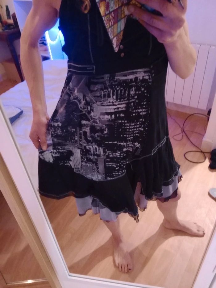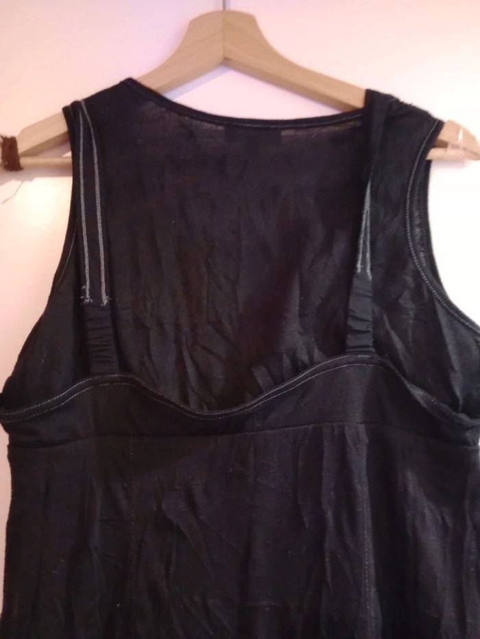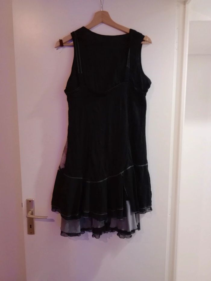 Jolie petite robe noire, manche débardeur, doublée dans le bas tissu type tulle Fantaisie décor type New York Indiquer taille 44 c'est plutôt une taille M car elle est tout à fait ajustée à ma taille et je porte du M #carineleray_femme_38
