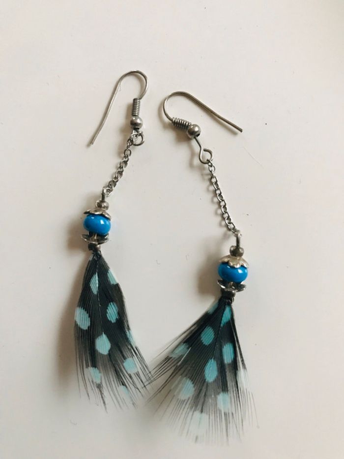 Très belles boucles d’oreilles plume noire et turquoise