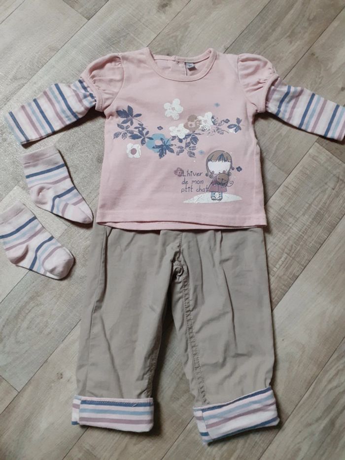 Neuf jamais porté, joli ensemble, t-shirt à boutons au dos col roulé, pantalon doublé taille élastique, et chaussettes
