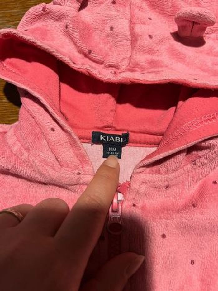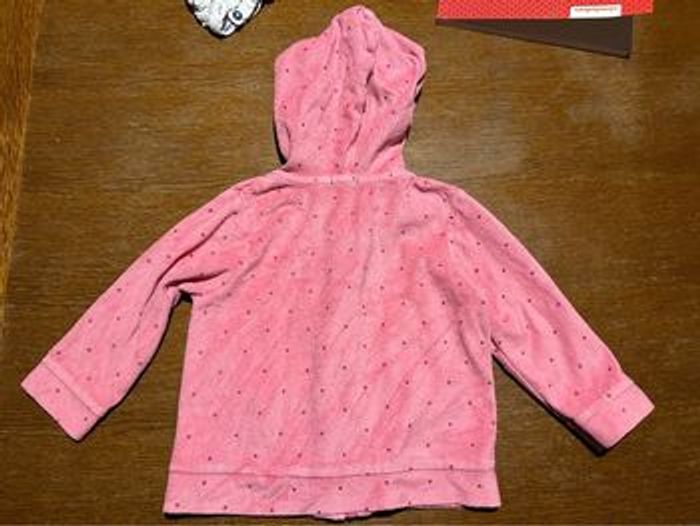Gilet zippé à capuche rose taille 18 mois marque Kiabi en bon état (la couleur de la fermeture a commencé à s’enlever)