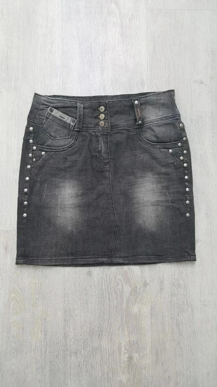 Jupe en jean grise effet usée Camaïeu 36, peut convenir à un grand 34 avec clous - photo numéro 1