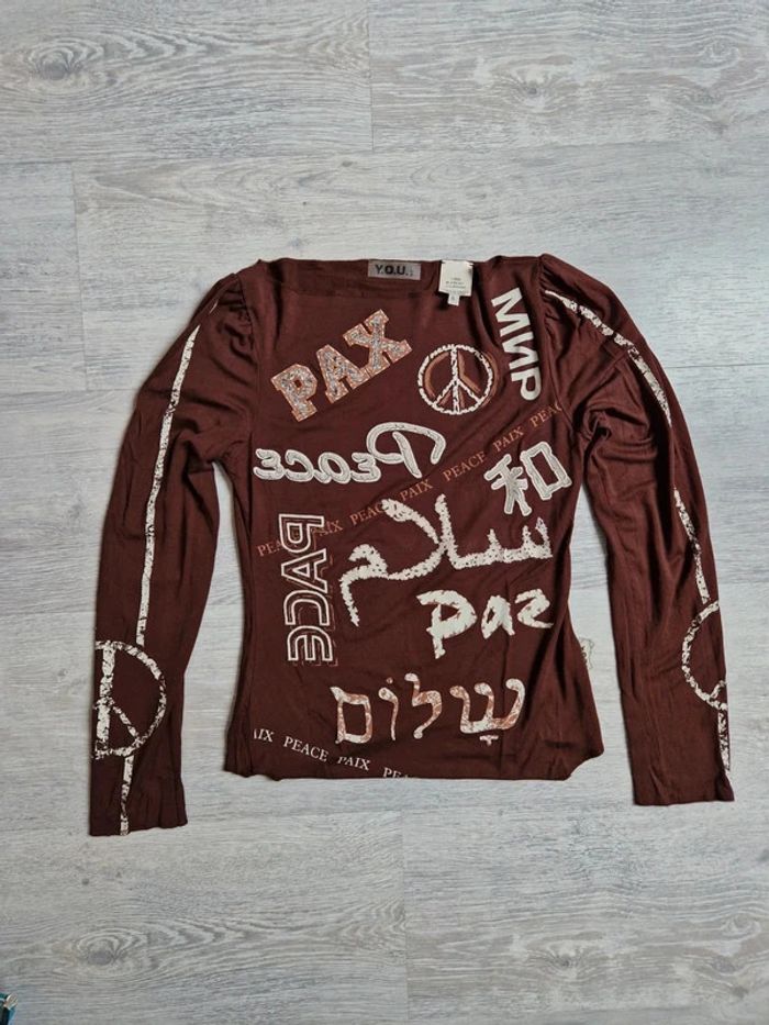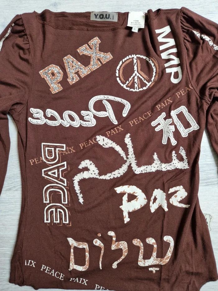 Tee-shirt Y.O.U. manches longues marron Taille S #julilo7femme Motif : paix et colombe Très bon état : à signaler une petit tache dans le dos (voir photo)