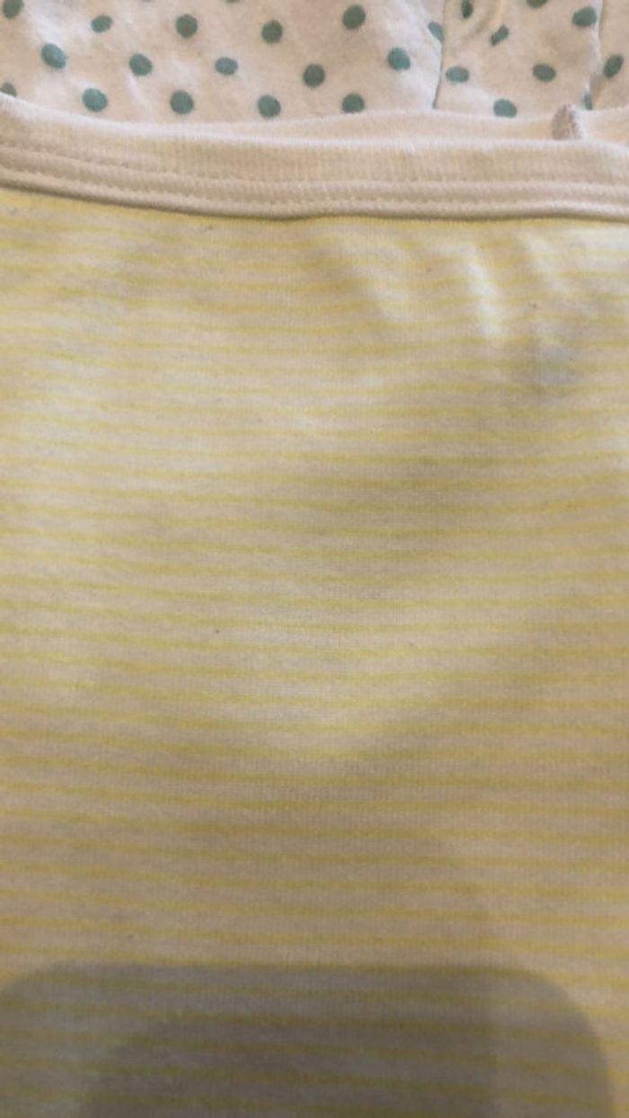 pyjama fin d été taille 2 ans mais je trouve plus 18 mois le haut est blanc à pois vert d eau et le bas est blanc à rayures jaunes