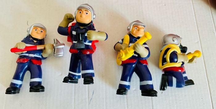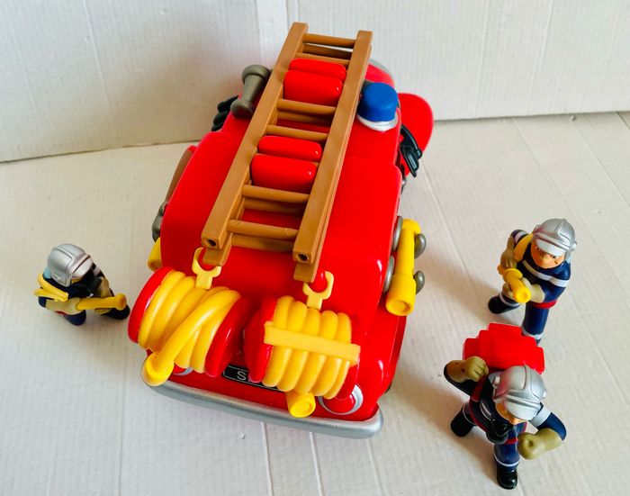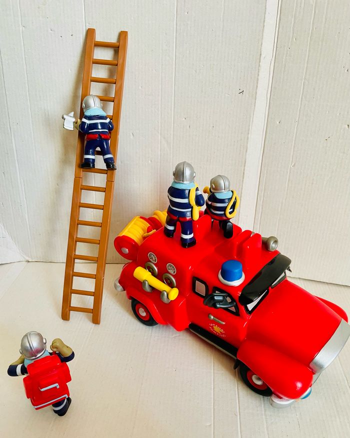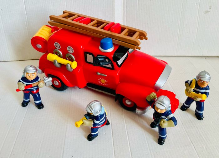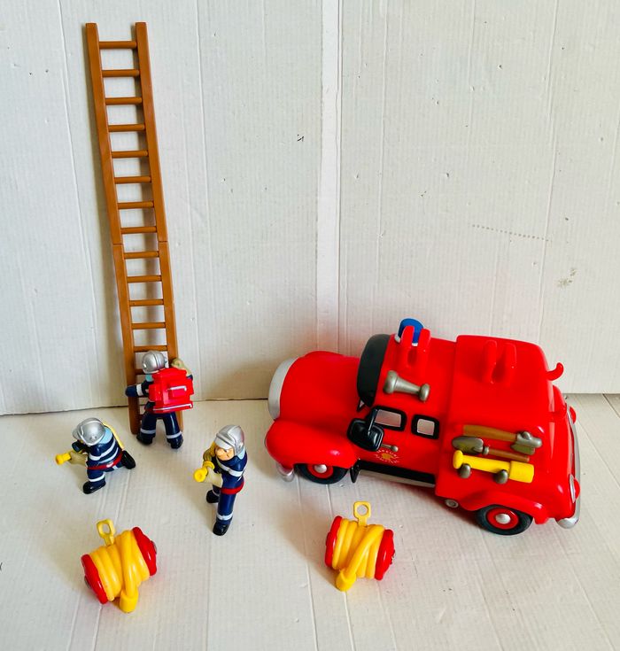 Camion de pompier 1er âge 4 figurines 2 tuyaux 1 échelle L camion 24 cm, l 11 cm, H 14 cm H figurines 7 cm Le camion roule très bien Pas de boîte
