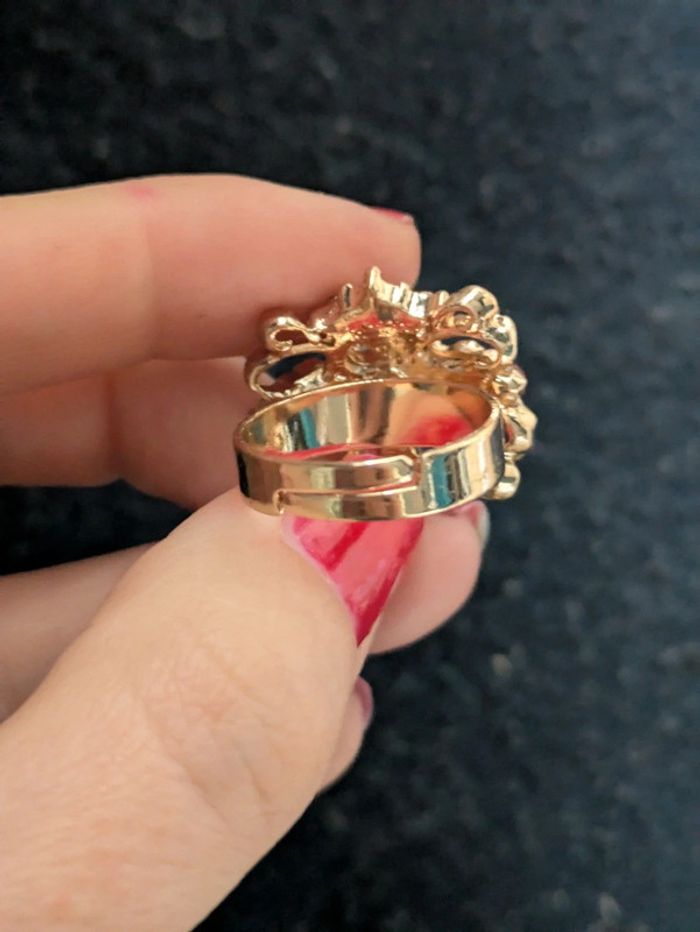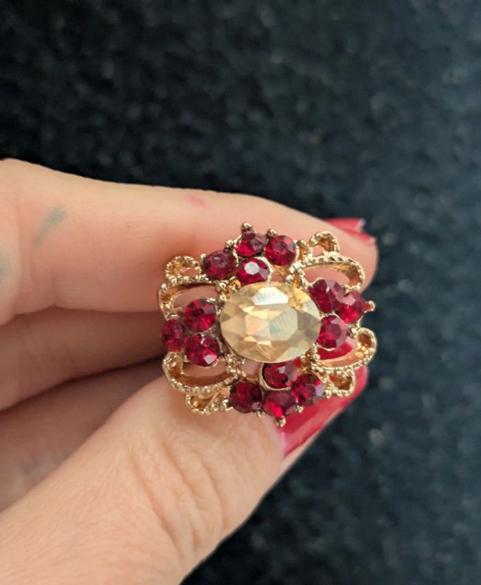 Bague fantaisie dorée en forme de fleur avec des strass bordeaux. Taille ajustable. N'hésitez pas a checker mon dressing j'ai beaucoup de paires dans ce style. Et il y a une remise sur les lots. Pour 1€ de plus je peux rajouter une pochette pochette à maquillage rouge avec un petit miroir, si cela vous intéresse envoyez moi un message. #morganelcfbijoux