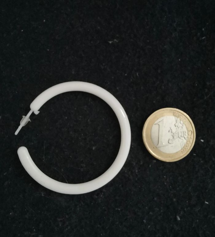 Créoles blanches style retro. 4cm de diametre. Pour 1€ de plus je peux rajouter une pochette à maquillage rouge avec un petit miroir, si cela vous intéresse envoyez moi un message. Remise sur les lots profitez en, j'ai énormément de paires dans mon dressing #morganelcfbijoux