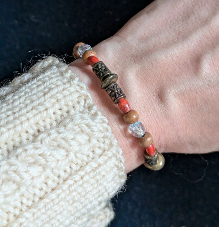 Bracelet élastique a perles marrons et oranges. Vintage. Pour 1€ de plus je peux rajouter une pochette à maquillage rouge avec un petit miroir, si cela vous intéresse envoyez moi un message. Remise sur les lots profitez en, j'ai énormément de paires dans mon dressing #morganelcfbijoux