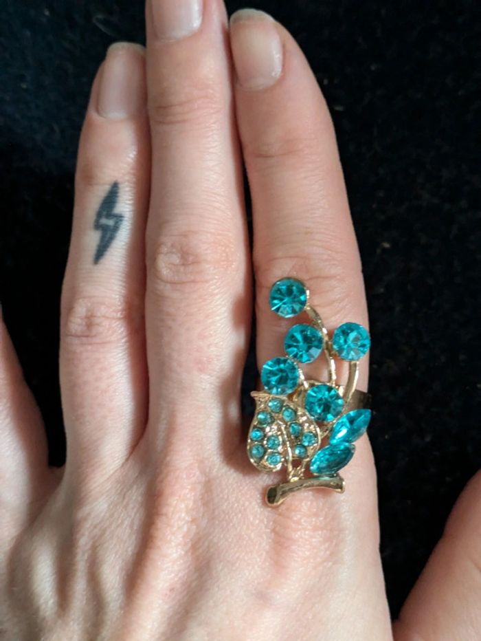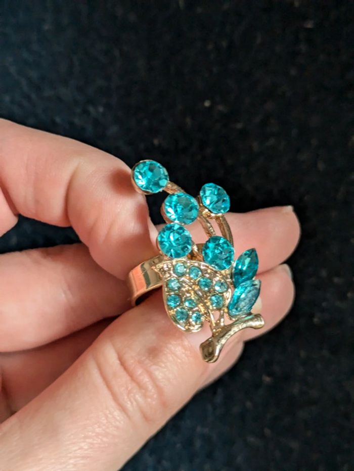 Bague fantaisie motif fleur,dorée a strass bleus. Taille ajustable. Pour 1€ de plus je peux rajouter une pochette à maquillage rouge avec un petit miroir, si cela vous intéresse envoyez moi un message. Remise sur les lots profitez en, j'ai énormément de paires dans mon dressing #morganelcfbijoux