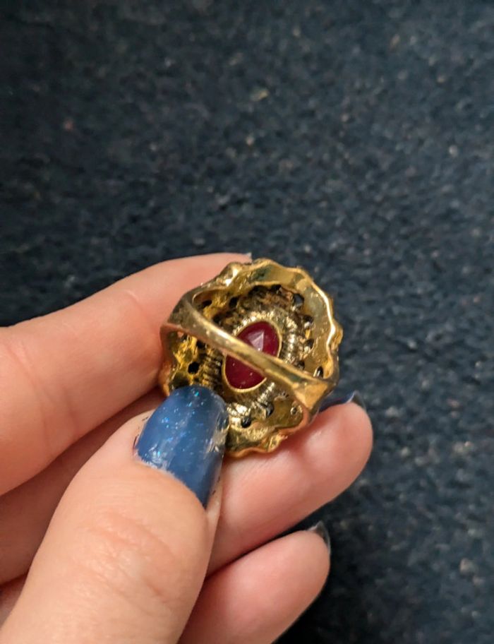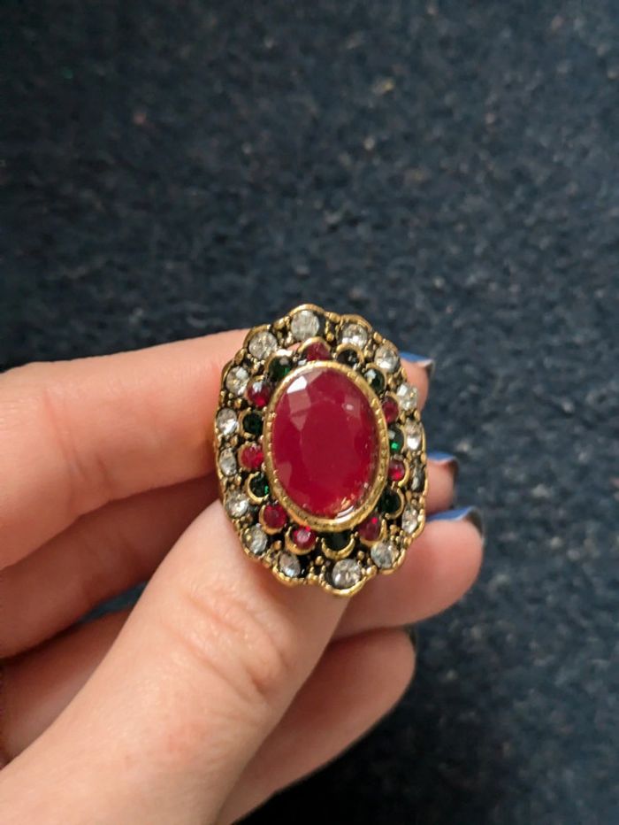 Bague dorée et bordeaux avec des strass argentés, verts et bordeaux. Taille 58. N'hésitez pas a checker mon dressing j'ai beaucoup de bijoux dans ce style. Et il y a une remise sur les lots. Pour 1€ de plus je peux rajouter une pochette pochette à maquillage rouge avec un petit miroir, si cela vous intéresse envoyez moi un message. #morganelcfbijoux