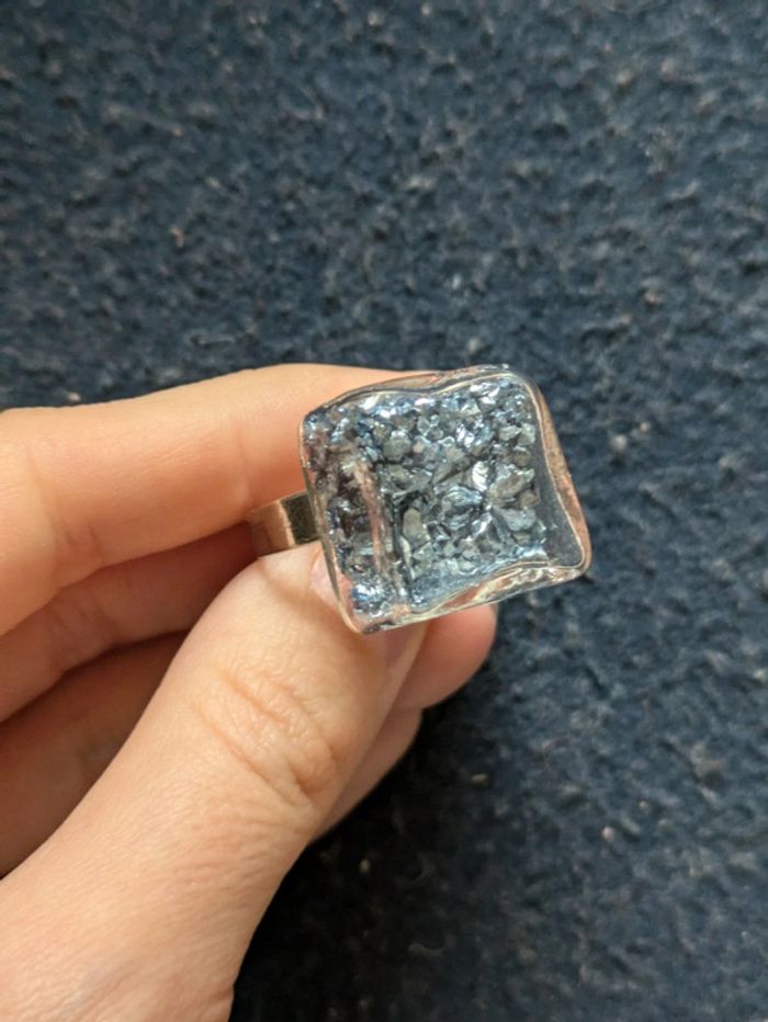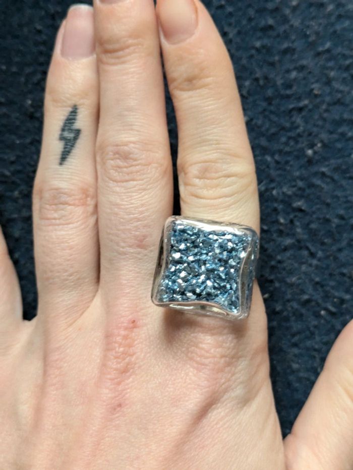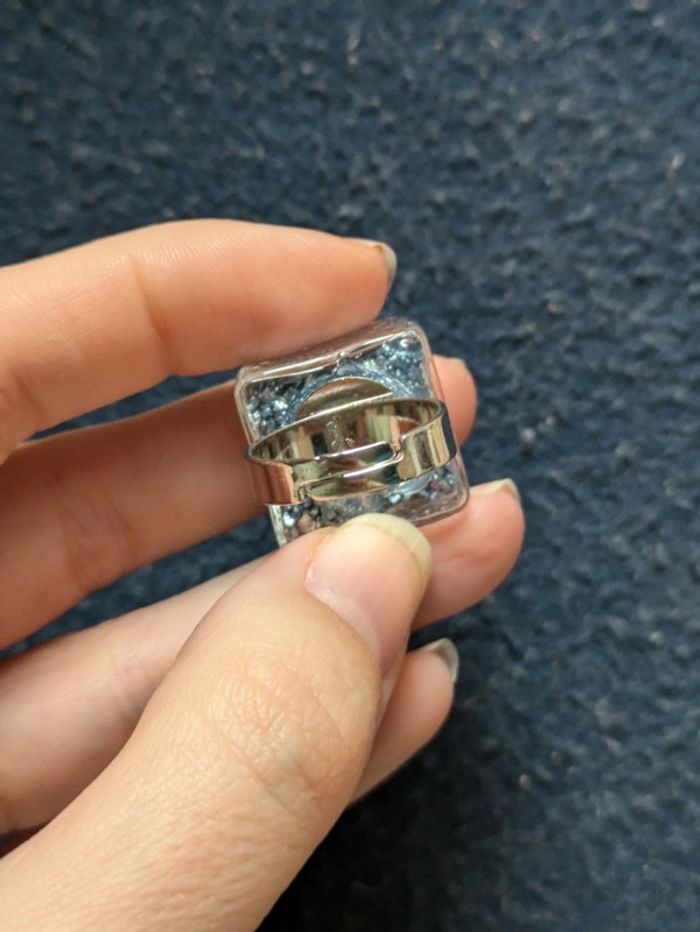 Bague fantaisie en verre transparente remplie de paillettes couleur bleue. Taille ajustable. N'hésitez pas a checker mon dressing j'ai beaucoup de paires dans ce style. Et il y a une remise sur les lots. Pour 1€ de plus je peux rajouter une pochette pochette à maquillage rouge avec un petit miroir, si cela vous intéresse envoyez moi un message. #morganelcfbijoux