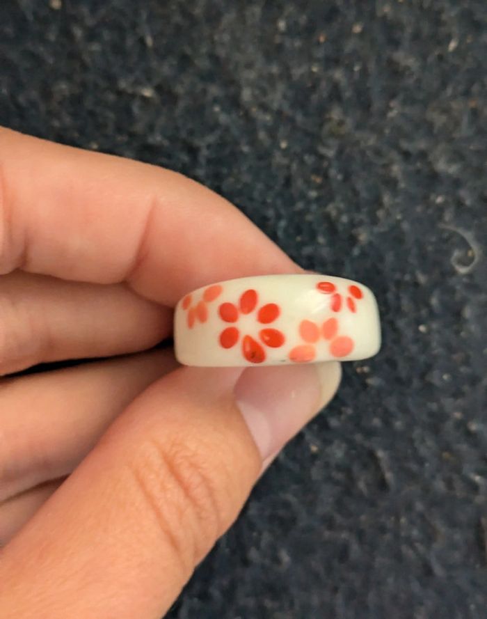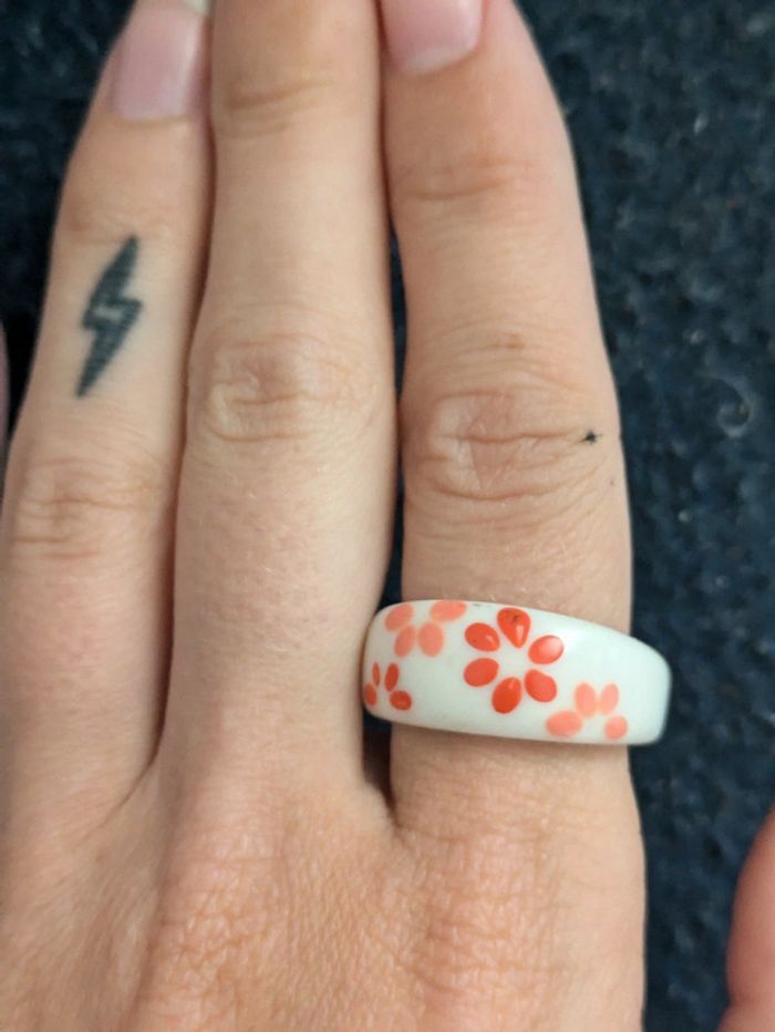 Bague fantaisie en plastique blanche avec des motifs fleuris oranges. Taille 61. N'hésitez pas a checker mon dressing j'ai beaucoup de bagues dans ce style. Et il y a une remise sur les lots. Pour 1€ de plus je peux rajouter une pochette pochette à maquillage rouge avec un petit miroir, si cela vous intéresse envoyez moi un message. #morganelcfbijoux