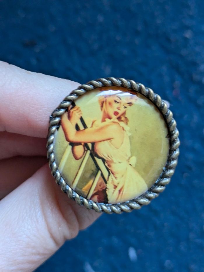 Bague fantaisie ronde avec un dessin de pinup. Taille ajustable. Pour 1€ de plus je peux rajouter une pochette à maquillage rouge avec un petit miroir, si cela vous intéresse envoyez moi un message. Remise sur les lots profitez en, j'ai énormément de paires dans mon dressing #morganelcfbijoux