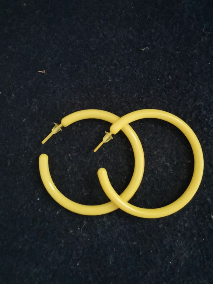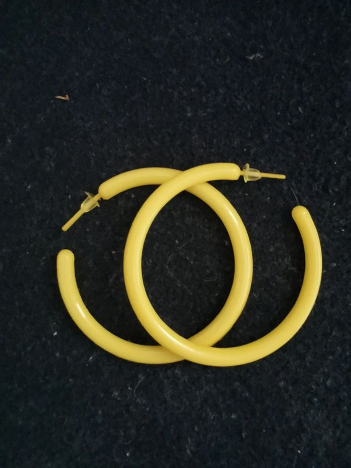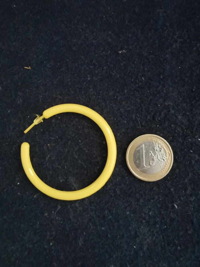 Créoles fines jaunes neuves. 4cm de diamètre. Pour 1€ de plus je peux rajouter une pochette à maquillage rouge avec un petit miroir, si cela vous intéresse envoyez moi un message. Remise sur les lots profitez en, j'ai énormément de paires dans mon dressing #morganelcfbijoux