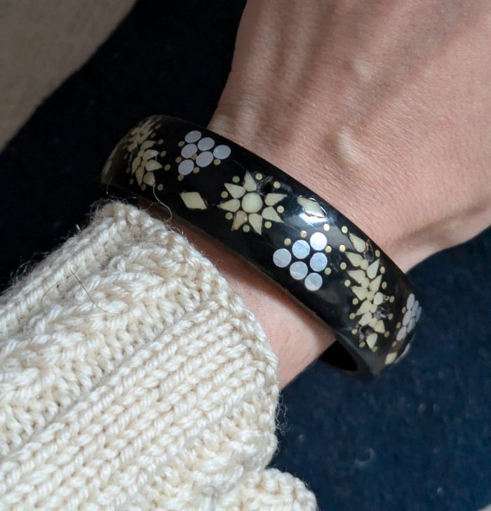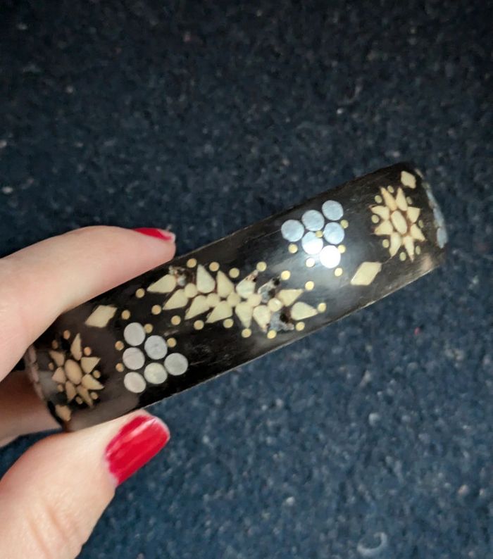 Jonc noir avec des motifs dorés et blancs nacrés. Vintage, années 80. Pour 1€ de plus je peux rajouter une pochette à maquillage rouge avec un petit miroir, si cela vous intéresse envoyez moi un message. Remise sur les lots profitez en, j'ai énormément de paires dans mon dressing #morganelcfbijoux