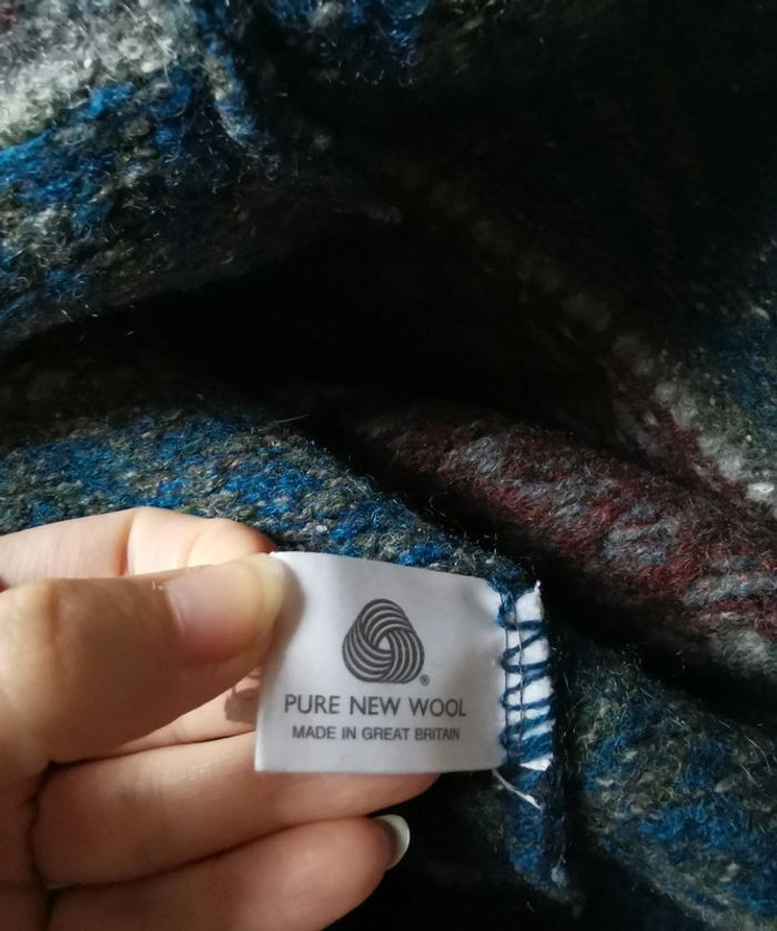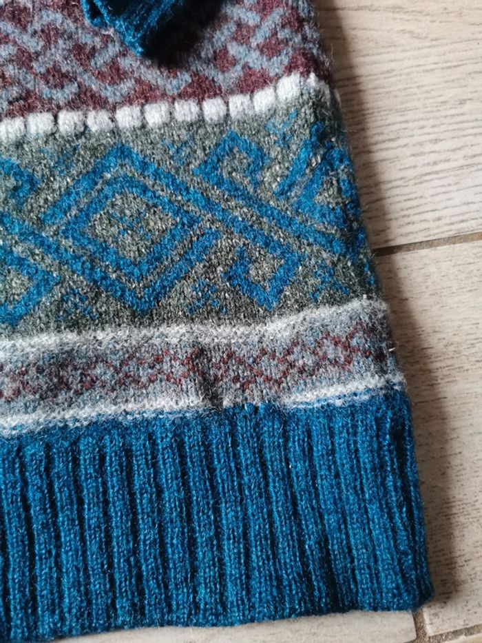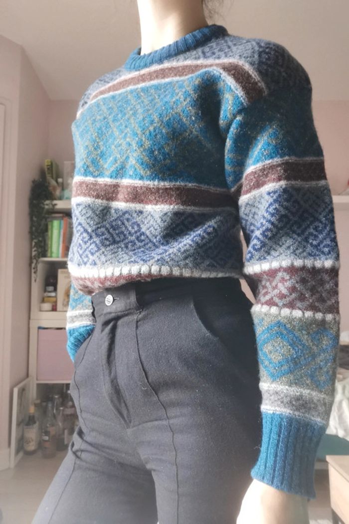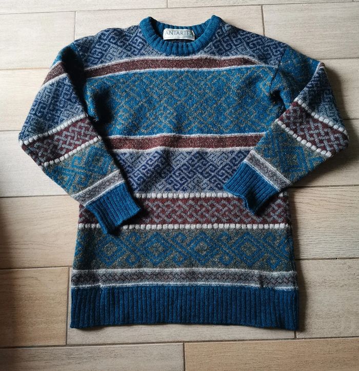 Très beau pull en laine vintage, années 80. A motifs géométriques, bleus et marron. Il tient très chaud ! Je pense que c'est plus un pull homme mais se porte très bien un peu Oversize. Attention il y a quelques défauts (cf photos), deux trous qui ont été reprisés et un tout petit qui peut facilement être arrangé.