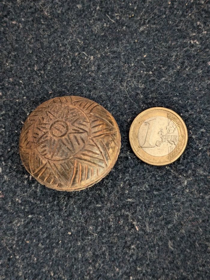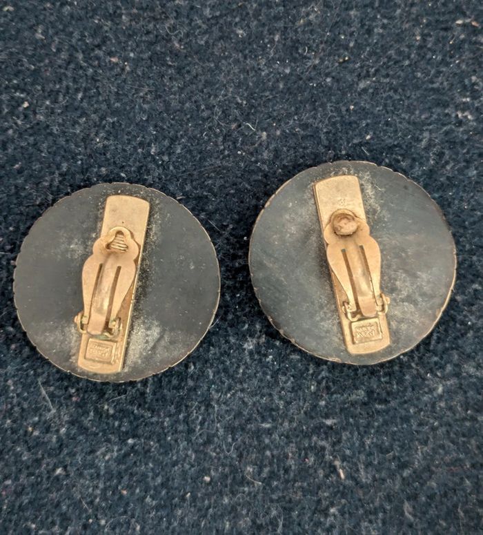 Boucles d'oreilles rondes marrons a clips signées P&M. Vintage, années 80. Pour 1€ de plus je peux rajouter une pochette à maquillage rouge avec un petit miroir, si cela vous intéresse envoyez moi un message. Remise sur les lots profitez en, j'ai énormément de paires dans mon dressing #morganelcfbijoux