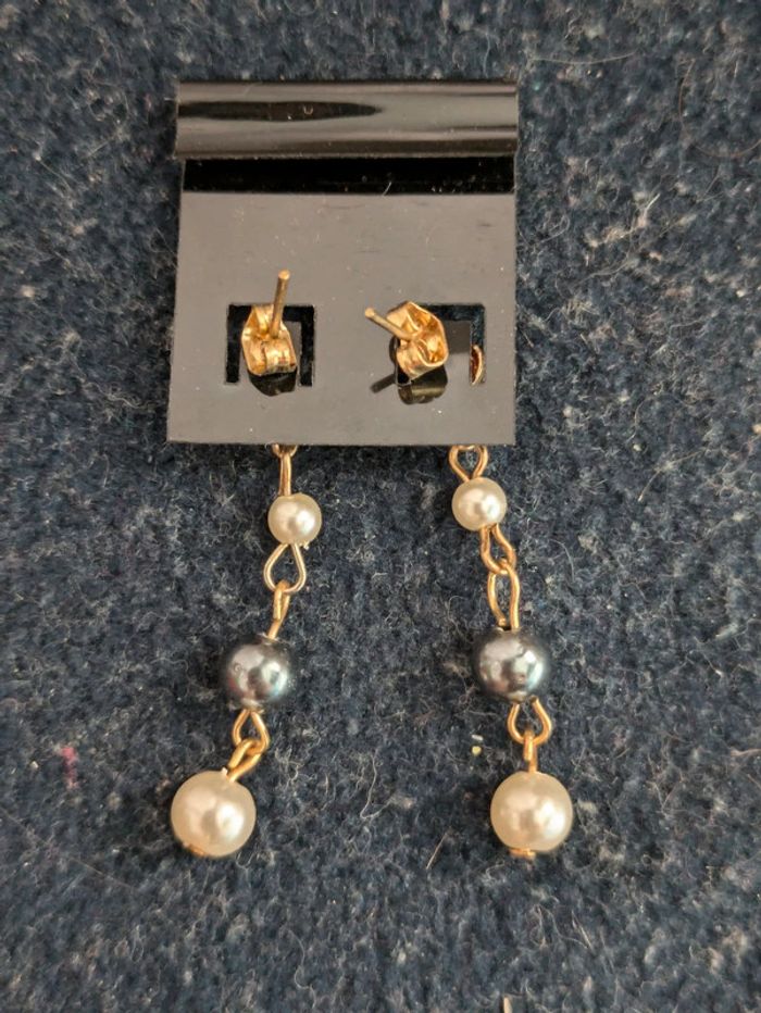 Boucles d'oreilles pendantes fantaisie avec des perles grises et blanches. Vintage, années 80. Pour 1€ de plus je peux rajouter une pochette à maquillage rouge avec un petit miroir, si cela vous intéresse envoyez moi un message. Remise sur les lots profitez en, j'ai énormément de paires dans mon dressing #morganelcfbijoux