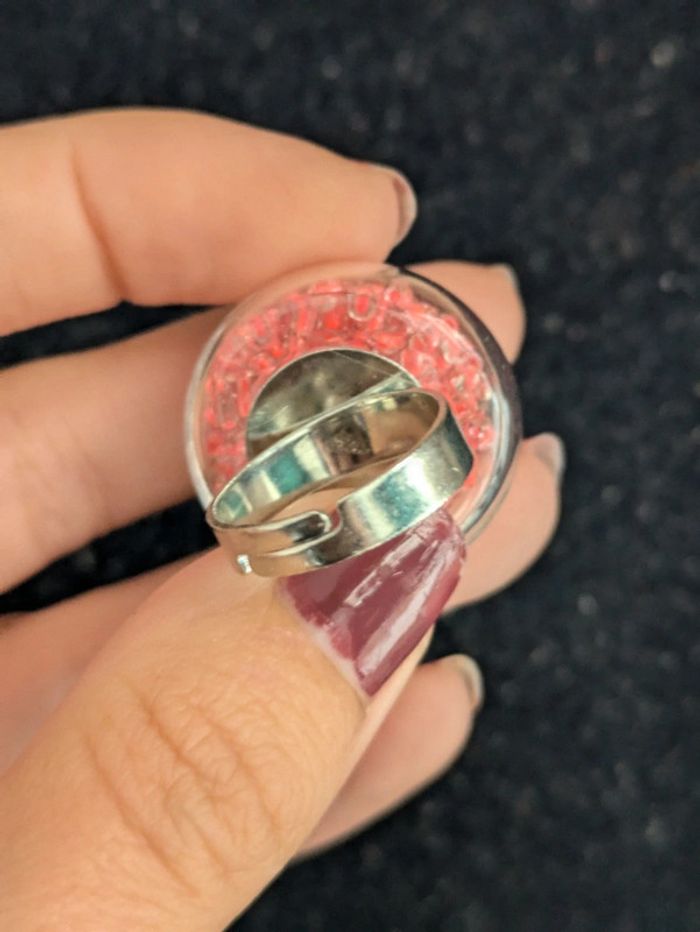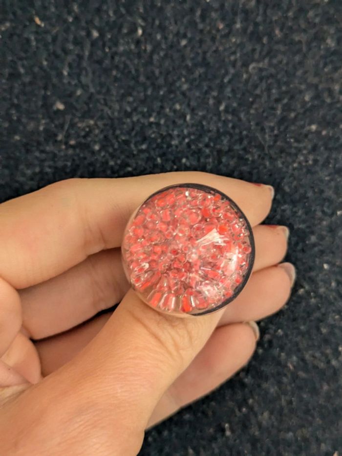 Bague fantaisie en verre transparente remplie de perles rouges/corail. Taille ajustable. N'hésitez pas a checker mon dressing j'ai beaucoup de paires dans ce style. Et il y a une remise sur les lots. Pour 1€ de plus je peux rajouter une pochette pochette à maquillage rouge avec un petit miroir, si cela vous intéresse envoyez moi un message. #morganelcfbijoux