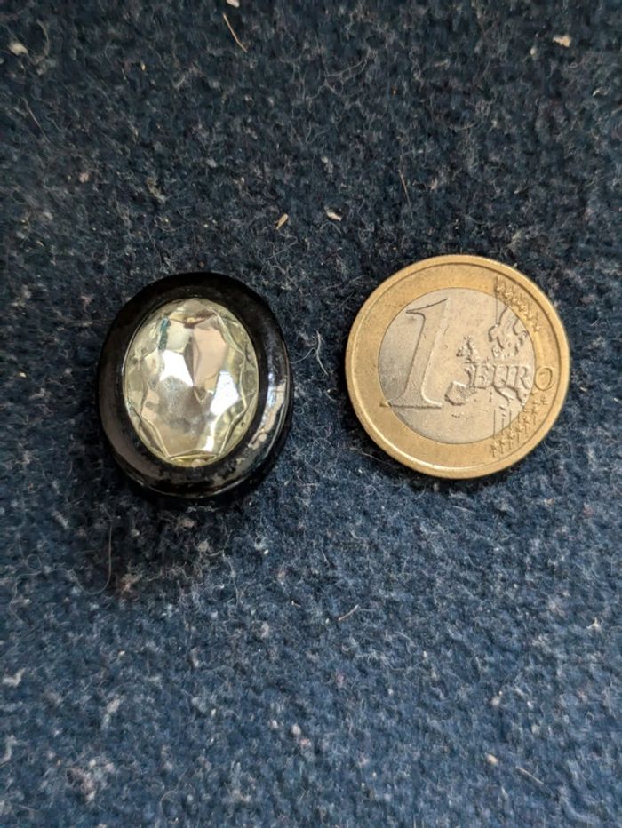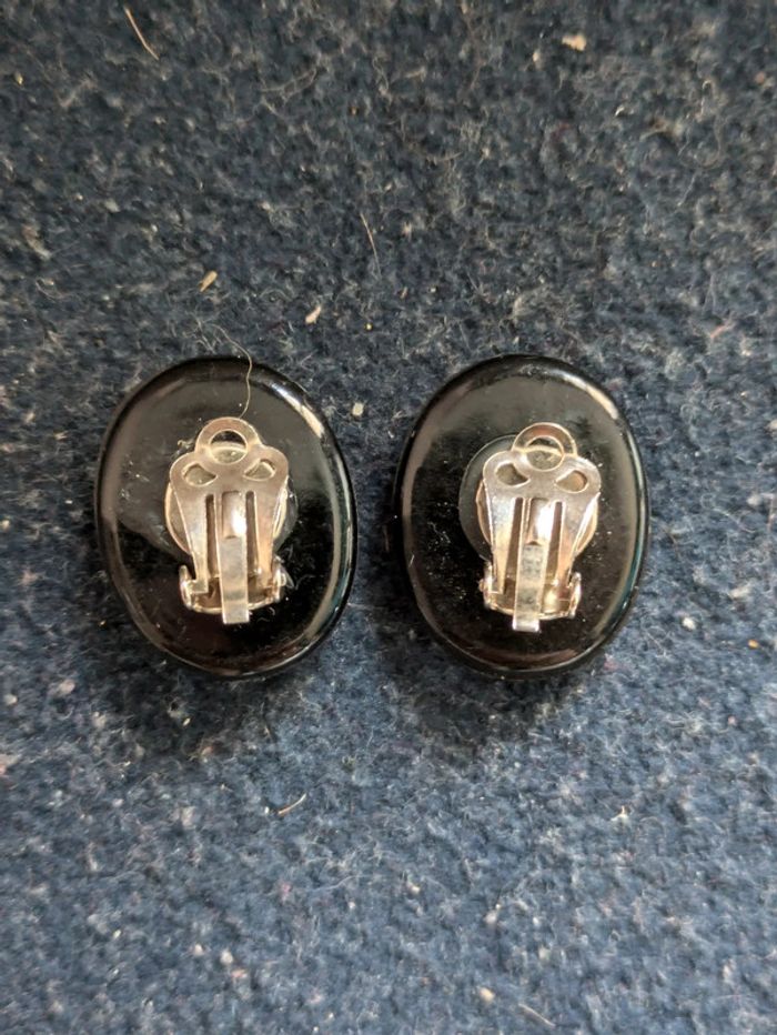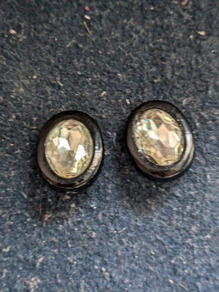 Boucles d'oreilles noires avec un strass argenté. Vintage, années 80. Pour 1€ de plus je peux rajouter une pochette à maquillage rouge avec un petit miroir, si cela vous intéresse envoyez moi un message. Remise sur les lots profitez en, j'ai énormément de paires dans mon dressing #morganelcfbijoux