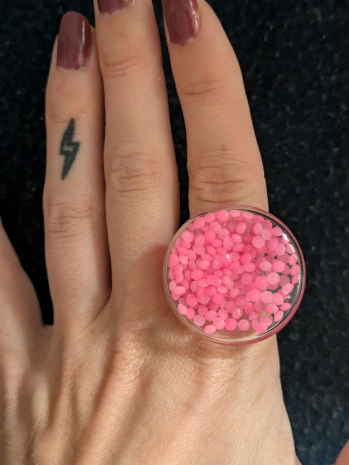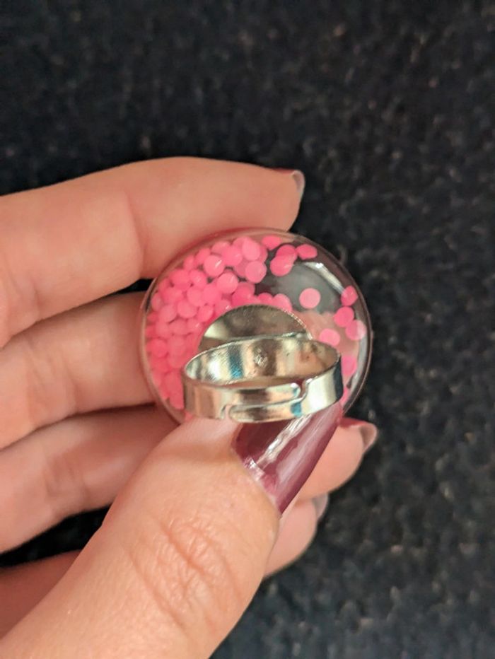 Bague fantaisie en verre transparente remplie de perles roses. Taille ajustable. N'hésitez pas a checker mon dressing j'ai beaucoup de paires dans ce style. Et il y a une remise sur les lots. Pour 1€ de plus je peux rajouter une pochette pochette à maquillage rouge avec un petit miroir, si cela vous intéresse envoyez moi un message. #morganelcfbijoux